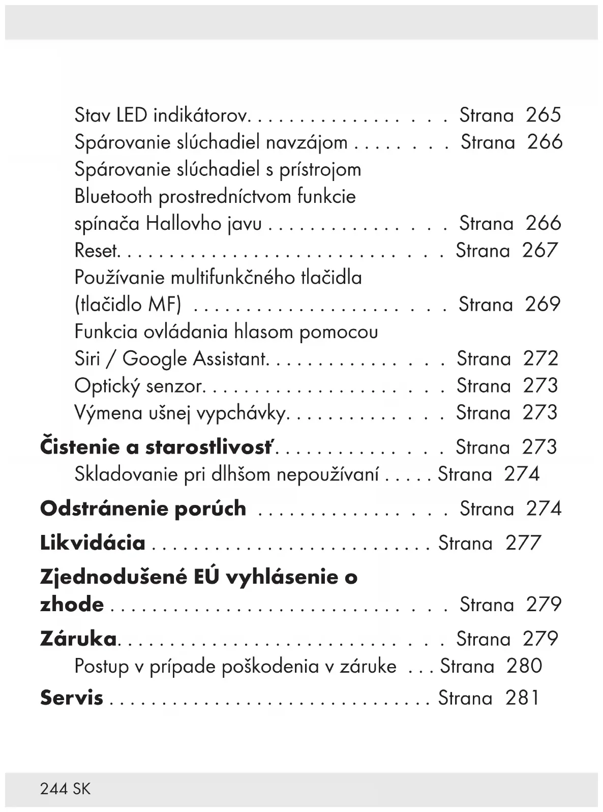 - Túto funkciu musí podporovať váš poskytovateľ mobilných služieb. Vyzváňací tón (alebo upozornenie „Incoming call“ [prichádzajúci hovor], podľa telefónu) a hlas volajúceho sa prehrávajú cez reproduktor slúchadla[1]. Mikrofón[5] zaznamená váš hlas.272 SK Prehrávanie hudby sa automaticky zastaví v prípade prichádzajúceho hovoru. Hudba pokračuje po ukončení hovoru. Funkcia ovládania hlasom pomocou Siri/ Google Assistant Aktivujte Siri alebo Google Assistant na vašom mobilnom prístroji. iOS: Zriaďte si Siri. Potom použite Siri na aktivovanie funkcie ovládania hlasom v tomto produkte. Android: Otvorte Google Assistant. Skôr ako začnete používať funkciu ovládania hlasom na tomto produkte, skompletizujte nastavenia podľa pokynov Google Assistant. UPOZORNENIE: Google Assistant je k dispozícii v prístrojoch so systémom Android5.0alebo vyšším. Aktivujte funkciu Bluetooth. Spárujte si tento produkt s mobilným prístrojom. Na aktivovanie funkcie ovládania hlasom stlačte ľavé tlačidlo MF[3] 2xrýchlo po sebe. Teraz môžete používať funkciu ovládania hlasom.273SK Optický senzor Obidve slúchadlá[1] sú vybavené optickým senzorom[4]. Keď si slúchadlo[1] vyberiete z ucha, prehrávanie zvuku sa preruší. Keď si slúchadlo[1] vložíte znovu do ucha, prehrávanie zvuku bude automaticky pokračovať. Výmena ušnej vypchávky Pred výmenou ušnej vypchávky: Vypnite produkt. Odstráňte ušné vypchávky strednej[] veľkosti zo slúchadiel[1] (obr.C). Vyberte si malé alebo veľké ušné vypchávky[][] a nasuňte ich na slúchadlá[1] (obr.D). Čistenie a starostlivosť m OPATRNE! Možné poškodenie produktu! Produkt pred čistením vypnite a odpojte všetky zástrčky! Dbajte na to, aby sa počas čistenia nedostala do produktu vlhkosť, aby sa zabránilo poškodeniu produktu a nutných opráv.274 SK Ušné vypchávky[], [] a [] sa dajú pri čistení slúchadiel[1] vybrať. Ušné vypchávky čistite pod tečúcou vodou. Pred opätovným nasadením nechajte ušné vypchávky úplne uschnúť. Produkt čistite mierne navlhčenou utierkou bez chlpov a jemným čistiacim prostriedkom! Na čistenie produktu nepoužívajte žiadne leptavé ani abrazívne čistiace prostriedky. Skladovanie pri dlhšom nepoužívaní Produkt skladujte na suchom mieste, chránený pred prachom a priamym slnečným žiarením. Slúchadlá odložte do nabíjacieho a odkladacieho boxu[7]. Dlhšie skladovanie: Aby ste zabránili poškodeniu akumulátora, nabíjajte ho minimálne každých 12mesiacov. Odstránenie porúch = Chyba = Možná príčina = Činnosť = Žiadne funkcie = Batéria je vybitá.275SK = Batériu nabíjacieho a odkladacieho boxu[7] nabite podľa popisu v kapitole „Nabitie akumulátora v nabíjacom a odkladacom boxe“. Slúchadlá[1] nabite podľa popisu v kapitole „Nabitie slúchadiel“. = Žiadne spojenie Bluetooth = Chyba pri obsluhe slúchadiel. = Slúchadlá vypnite a znova zapnite. = Chyba v prístroji Bluetooth. = Odpojte spojenie so slúchadlami. Spojenie znova obnovte. = Skontrolujte, či slúchadlá fungujú s iným prístrojom Bluetooth. = Chyba spojenia s Bluetooth. = Posuňte sa bližšie k prístrojom Bluetooth. = Žiadny zvuk = Chyba pri obsluhe prístroja Bluetooth. = Zvýšenie hlasitosti na prehrávacom prístroji. = Chyba spojenia s Bluetooth. = Posuňte sa bližšie k prístrojom Bluetooth. = Odpojte pripojený prístroj Bluetooth. Spojenie znova obnovte. = Nie sú k dispozícii všetky funkcie. = Chyba v prístroji Bluetooth. = Skontrolujte, či váš prístroj Bluetooth podporuje všetky funkcie.276 SK = Bezdrôtové nabíjanie Qi nabíjacieho a odkladacieho boxu[7] sa nespustilo. = Nabíjací a odkladací box[7] sa v dôsledku nabíjania ohrial. = Odoberte nabíjací a odkladací box[7] z nabíjacieho povrchu Qi, aby vychladol. Skontrolujte, či produkt nevykazuje škody. = Tento produkt sa nachádza na mieste, na ktoré vplývajú silné rádiové vlny alebo hluk, ako napr. televízne veže, elektrárne alebo čerpacie stanice. = V takýchto prostrediach použite na nabíjanie nabíjacieho a odkladacieho boxu [7] iné výstupné porty, ako napr. USB port typuC. = Bezdrôtové nabíjanie sa nespustilo. = Nabíjací a odkladací box[7] nie je umiestnený v strede značky Qi na bezdrôtovej nabíjačke Qi. = Uistite sa, že nabíjací a odkladací box[7] je umiestnený v správnej polohe v strede bezdrôtovej nabíjačky Qi. = Uistite sa, že v bezdrôtovom rozsahu príjmu Qi[] sa nenachádzajú iné objekty. = Bezdrôtová rýchlosť nabíjania je pomalá. = Bezdrôtový rozsah príjmu Qi[] je príliš vzdialený od centra bezdrôtového nabíjacieho povrchu Qi.277SK = Uistite sa, že bezdrôtový rozsah príjmu Qi[] je umiestnený v správnej polohe v strede bezdrôtovej nabíjačky Qi. = Nabíjanie sa nespustí ani po umiestnení produktu do oblasti nabíjania. = Produkt nie je v správnej polohe. = Produkt umiestnite do blízkosti značky (ak sa tam nachádza) v strede nabíjacieho povrchu. Skôr než začnete s bezdrôtovým nabíjaním, prečítajte si aj návod na používanie pre bezdrôtovú nabíjačku Qi. Likvidácia Obal: Obal pozostáva z ekologických materiálov, ktoré môžete odovzdať na miestnych recyklačných zberných miestach. Všímajte si prosím označenie obalových materiálov pre triedenie odpadu, sú označené skratkami (a) a číslami (b) s nasledujúcim významom: 1–7: Plasty / 20–22: Papier a kartón / 80–98: Spojené látky.278 SK Výrobok: Informácie o možnostiach likvidácie opotrebovaného výrobku získate na Vašej správe obce alebo mesta. Bočne umiestnený symbol prečiarknutého kontajnera s kolieskami znamená, že tento prístroj podlieha smernici 2012/19/EÚ. Táto smernica hovorí, že prístroj na konci jeho životnosti nesmiete odhodiť do normálneho domového odpadu, ale ho musíte odovzdať na špeciálne zriadených zberných miestach, zariadeniach 