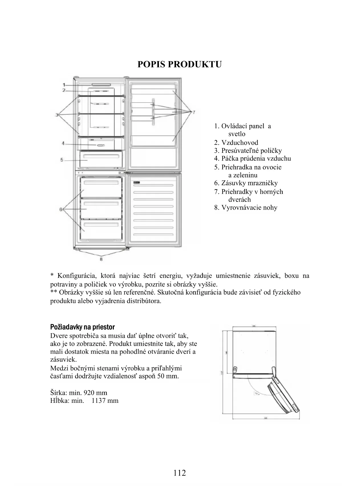Dvere spotrebica sa musia dat'uplene otvorit' tak, aka je to zobrazené. Produkt umiestnite tak, aby st Mali dostatok miesta na pohodlné otvaranie dveri azasuviek.