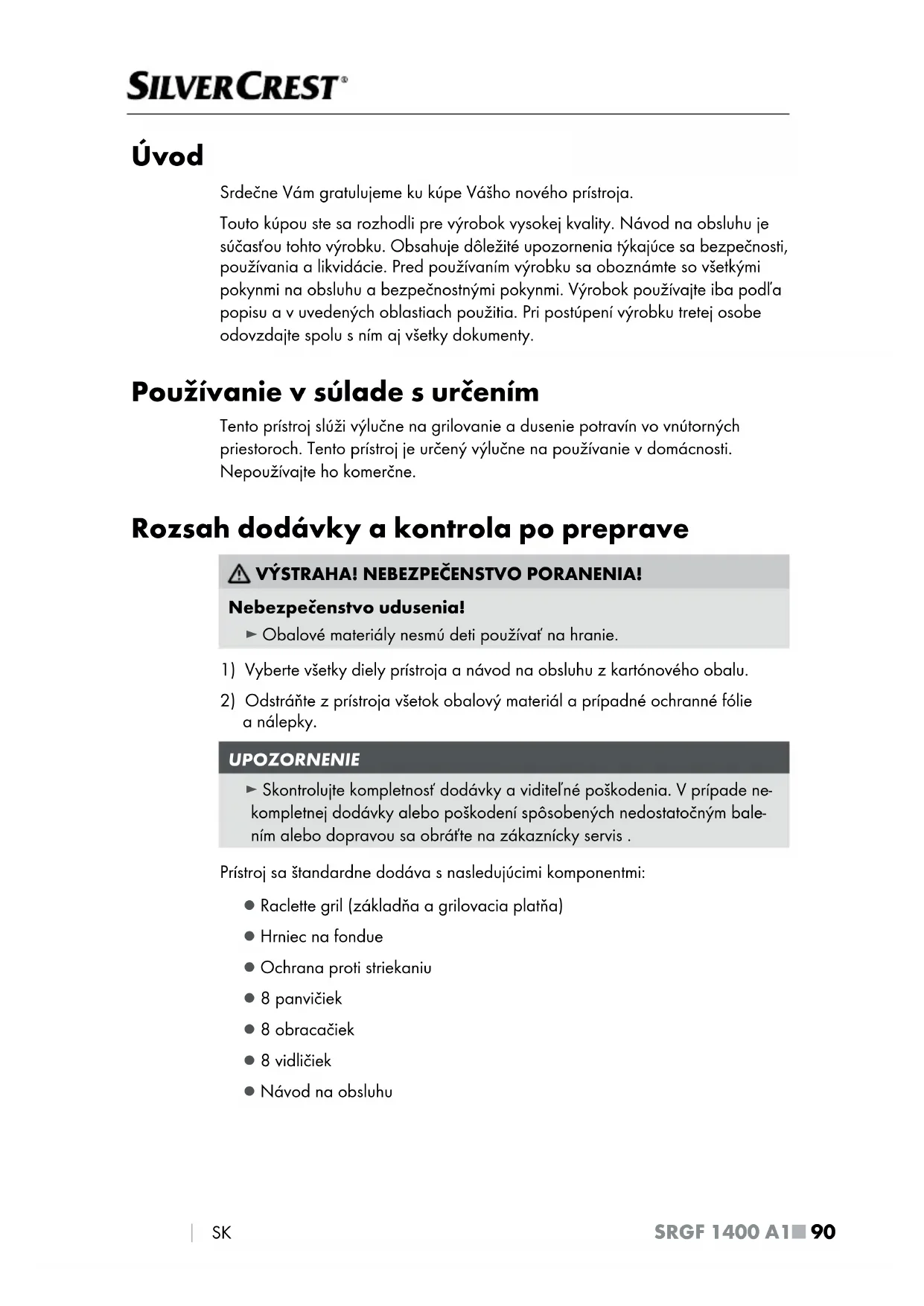SK Úvod Srdečne Vám gratulujeme ku kúpe Vášho nového prístroja. Touto kúpou ste sa rozhodli pre výrobok vysokej kvality. Návod naobsluhu je súčasťou tohto výrobku. Obsahuje dôležité upozornenia týkajúce sa bezpečnosti, používania a likvidácie. Pred používaním výrobku sa oboznámte sovšetkými pokynmi na obsluhu abezpečnostnými pokynmi. Výrobok používajte iba podľa popisu a vuvedených oblastiach použitia. Pri postúpení výrobku tretej osobe odovzdajte spolu sním aj všetky dokumenty. Používanie vsúlade surčením Tento prístroj slúži výlučne na grilovanie a dusenie potravín vo vnútorných priestoroch. Tento prístroj je určený výlučne na používanie vdomácnosti. Nepoužívajte ho komerčne. Rozsah dodávky akontrola po preprave VÝSTRAHA! NEBEZPEČENSTVO PORANENIA! Nebezpečenstvo udusenia! ► Obalové materiály nesmú deti používať na hranie.
