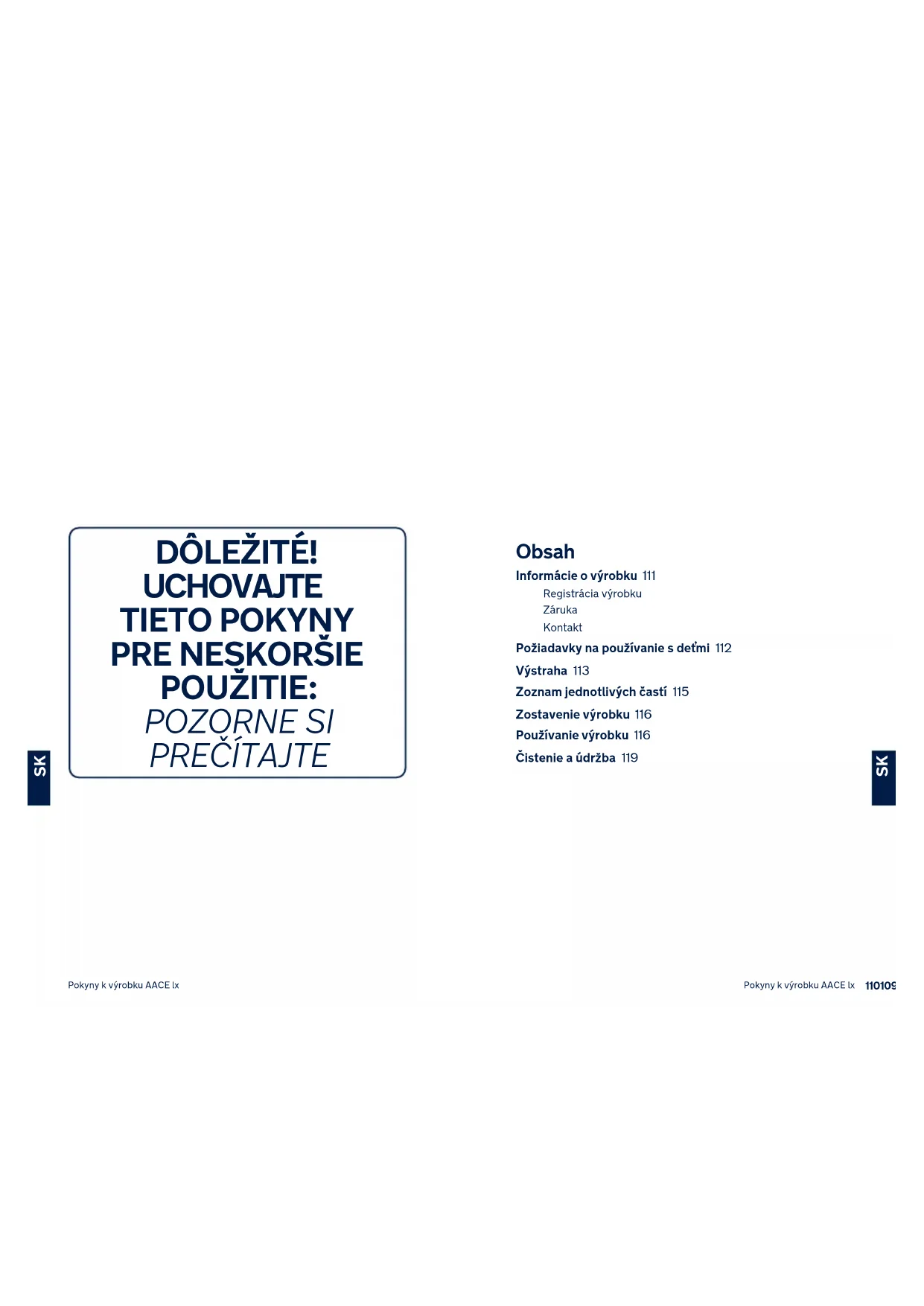 Pokyny k výrobku AACE lx Pokyny k výrobku AACE lxInformácie o výrobku Číslo modelu: ___________________________________________________________________________________________ Vyrobené v (dátum): ________________________________________________________________________________ Registrácia výrobku Vyplňte vyššie uvedené informácie. Číslo modelu a dátum výroby sú uvedené na spodnej strane výrobku AACE lx. Ak svoj výrobok chcete zaregistrovať, navštívte: www.nunababy.com Na domovskej stránke kliknite na odkaz „Registrovať zariadenie“. Záruka Zámerne sme navrhli naše výrobky vysokej kvality tak, aby mohli rásť s vaším dieťaťom aj vašou rodinou. Pretože si stojíme za naším výrobkom, naše vybavenie je kryté vlastnou zárukou na každý výrobok, začínajúc dňom zakúpenia. Ak nás budete kontaktovať, pripravte si doklad o kúpe, číslo modelu a dátum výroby. Viac informácií o záruke nájdete na stránke: www.nunababy.com Na domovskej stránke kliknite na odkaz „Záruka“. Kontakt Ohľadne náhradných dielov, servisu alebo ďalších otázok o záruke sa obráťte na naše oddelenie služieb zákazníkom. info@nunababy.com www.nunababy.com Požiadavky na používanie s deťmi Tento výrobok je vhodný na používanie s deťmi, ktoré spĺňajú nasledujúce požiadavky: