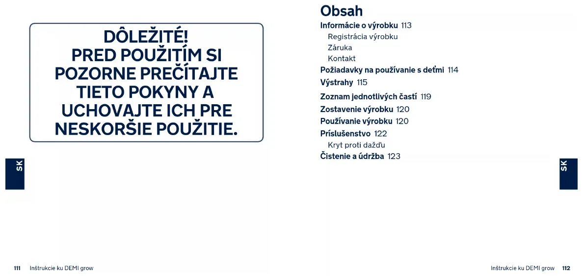 NESKORŠIE POUŽITIE. Obsah Informácie o výrobku 113 Registrácia výrobku Záruka Kontakt Požiadavky na používanie s deťmi 114 Výstrahy 115 Zoznam jednotlivých častí 119 Zostavenie výrobku 120 Používanie výrobku 120 Príslušenstvo 122 Kryt proti dažďu Čistenie a údržba 123113 Inštrukcie ku DEMI grow 114Inštrukcie ku DEMI grow