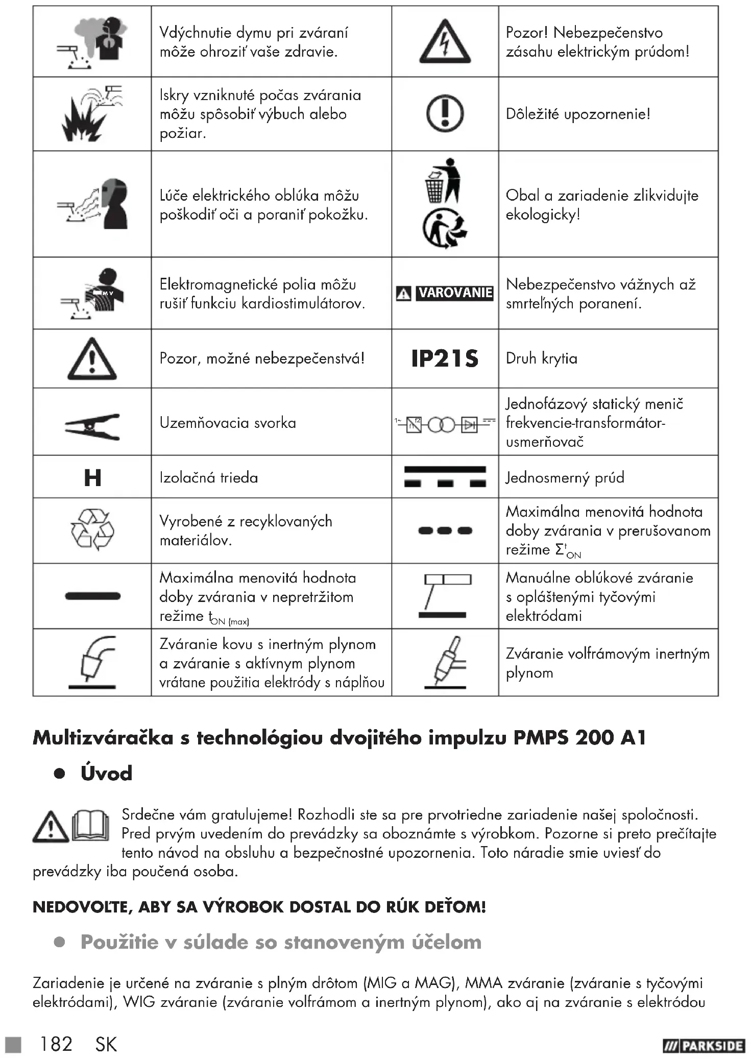 Maximálna menovitá hodnota doby zvárania v nepretržitom režime t ON (max) Manuálne oblúkové zváranie s opláštenými tyčovými elektródami Zváranie kovu s inertným plynom a zváranie s aktívnym plynom vrátane použitia elektródy s náplňou Zváranie volfrámovým inertným plynom Multizváračka s technológiou dvojitého impulzu PMPS 200 A1 z Úvod Srdečne vám gratulujeme! Rozhodli ste sa pre prvotriedne zariadenie našej spoločnosti. Pred prvým uvedením do prevádzky sa oboznámte s výrobkom. Pozorne si preto prečítajte tento návod na obsluhu a bezpečnostné upozornenia. Toto náradie smie uviesť do prevádzky iba poučená osoba. NEDOVOĽTE, ABY SA VÝROBOK DOSTAL DO RÚK DEŤOM! z Použitie v súlade sostanoveným účelom Zariadenie je určené na zváranie s plným drôtom (MIG a MAG), MMA zváranie (zváranie s tyčovými elektródami), WIG zváranie (zváranie volfrámom a inertným plynom), ako aj na zváranie s elektródouSK