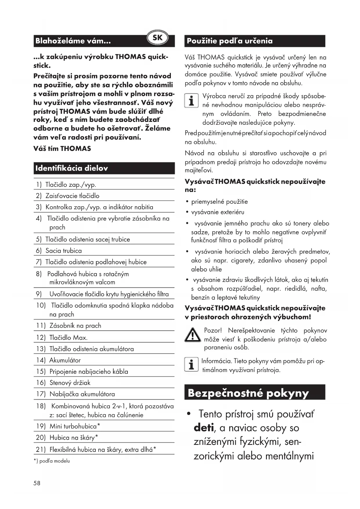 - vysávanie zdraviu škodlivých látok, ako aj tekutín s obsahom rozpúšťadiel, napr. riedidlá, nafta, benzín a leptavé tekutiny Vysávač THOMAS quickstick nepoužívajte v priestoroch ohrozených výbuchom! Pozor! Nerešpektovanie týchto pokynov môže viesť k poškodeniu prístroja a/alebo poraneniu osôb. Informácia. Tieto pokyny vám pomôžu pri op- timálnom využívaní prístroja. Bezpečnostné pokyny