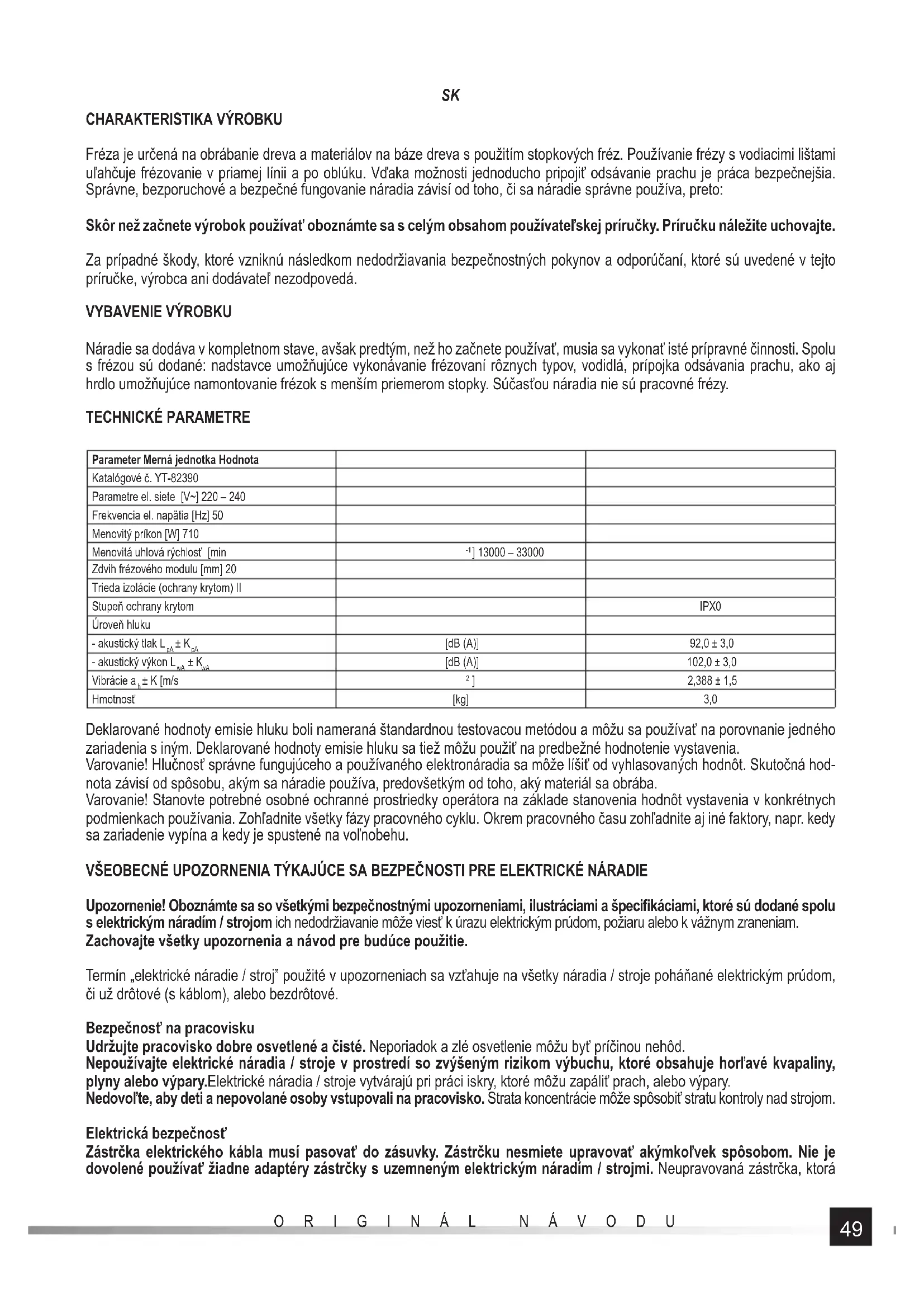 ] 2,388 ± 1,5 Hmotnosť [kg] 3,0 Deklarované hodnoty emisie hluku boli nameraná štandardnou testovacou metódou a môžu sa používať na porovnanie jedného zariadenia s iným. Deklarované hodnoty emisie hluku sa tiež môžu použiť na predbežné hodnotenie vystavenia. Varovanie! Hlučnosť správne fungujúceho a používaného elektronáradia sa môže líšiť od vyhlasovaných hodnôt. Skutočná hod- nota závisí od spôsobu, akým sa náradie používa, predovšetkým od toho, aký materiál sa obrába. Varovanie! Stanovte potrebné osobné ochranné prostriedky operátora na základe stanovenia hodnôt vystavenia v konkrétnych podmienkach používania. Zohľadnite všetky fázy pracovného cyklu. Okrem pracovného času zohľadnite aj iné faktory, napr. kedy sa zariadenie vypína a kedy je spustené na voľnobehu. VŠEOBECNÉ UPOZORNENIA TÝKAJÚCE SA BEZPEČNOSTI PRE ELEKTRICKÉ NÁRADIE Upozornenie! Oboznámte sa so všetkými bezpečnostnými upozorneniami, ilustráciami a špecifi káciami, ktoré sú dodané spolu s elektrickým náradím / strojom ich nedodržiavanie môže viesť k úrazu elektrickým prúdom, požiaru alebo k vážnym zraneniam. Zachovajte všetky upozornenia a návod pre budúce použitie. Termín „elektrické náradie / stroj” použité v upozorneniach sa vzťahuje na všetky náradia / stroje poháňané elektrickým prúdom, či už drôtové (s káblom), alebo bezdrôtové. Bezpečnosť na pracovisku Udržujte pracovisko dobre osvetlené a čisté. Neporiadok a zlé osvetlenie môžu byť príčinou nehôd. Nepoužívajte elektrické náradia / stroje v prostredí so zvýšeným rizikom výbuchu, ktoré obsahuje horľavé kvapaliny, plyny alebo výpary.Elektrické náradia / stroje vytvárajú pri práci iskry, ktoré môžu zapáliť prach, alebo výpary. Nedovoľte, aby deti a nepovolané osoby vstupovali na pracovisko. Strata koncentrácie môže spôsobiť stratu kontroly nad strojom. Elektrická bezpečnosť Zástrčka elektrického kábla musí pasovať do zásuvky. Zástrčku nesmiete upravovať akýmkoľvek spôsobom. Nie je dovolené používať žiadne adaptéry zástrčky s uzemneným elektrickým náradím / strojmi. Neupravovaná zástrčka, ktorá50