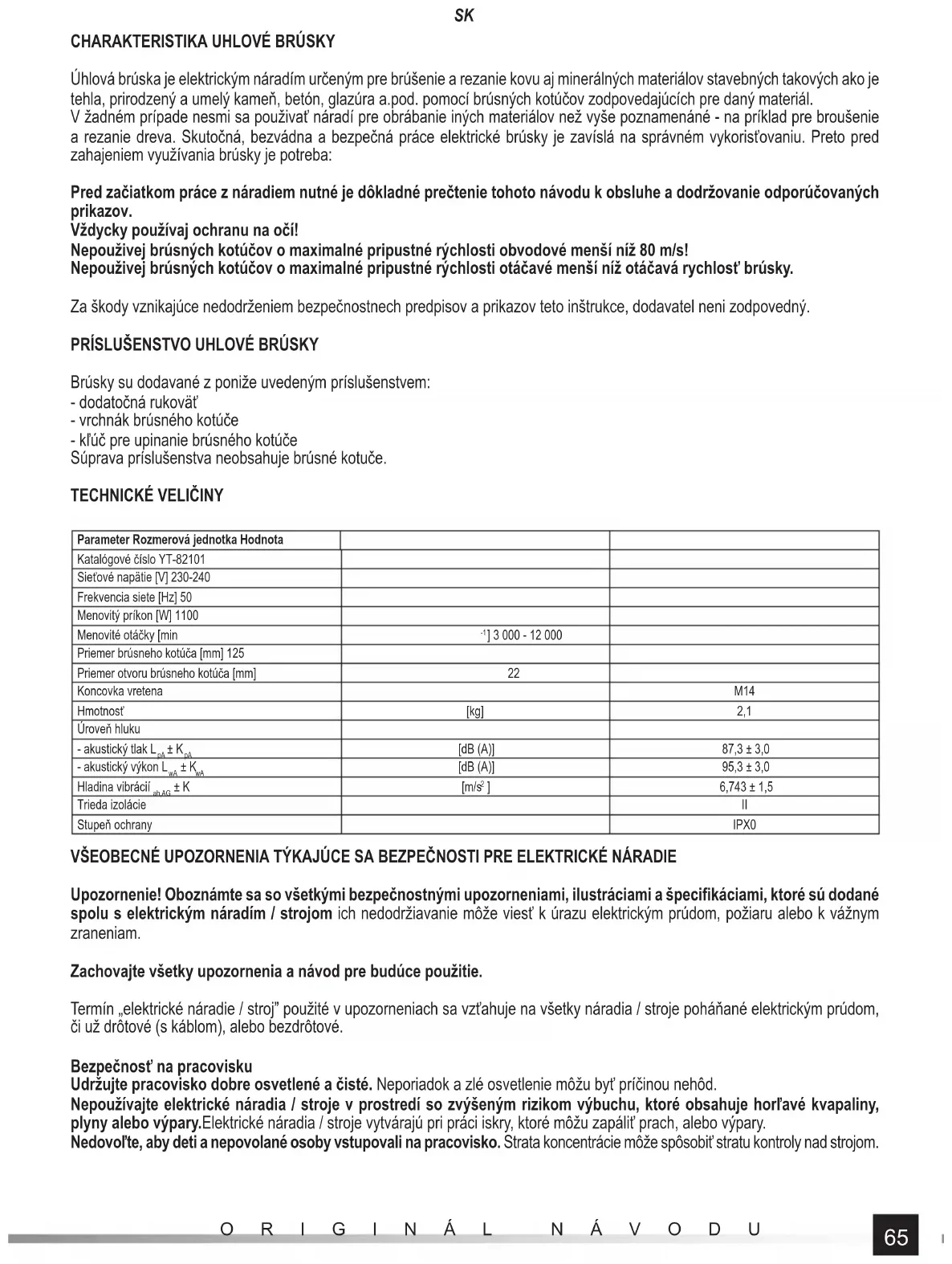 Úhlová brúska je elektrickým náradím určeným pre brúšenie a rezanie kovu aj minerálných materiálov stavebných takových ako je tehla, prirodzený a umelý kameň, betón, glazúra a.pod. pomocí brúsných kotúčov zodpovedajúcích pre daný materiál. V žadném prípade nesmi sa použivať náradí pre obrábanie iných materiálov než vyše poznamenáné - na príklad pre broušenie a rezanie dreva. Skutočná, bezvádna a bezpečná práce elektrické brúsky je zavíslá na správném vykorisťovaniu. Preto pred zahajeniem využívania brúsky je potreba: Pred začiatkom práce z náradiem nutné je dôkladné prečtenie tohoto návodu k obsluhe a dodržovanie odporúčovaných prikazov. Vždycky používaj ochranu na očí! Nepouživej brúsných kotúčov o maximalné pripustné rýchlosti obvodové menší níž 80 m/s! Nepouživej brúsných kotúčov o maximalné pripustné rýchlosti otáčavé menší níž otáčavá rychlosť brúsky. Za škody vznikajúce nedodrženiem bezpečnostnech predpisov a prikazov teto inštrukce, dodavatel neni zodpovedný.