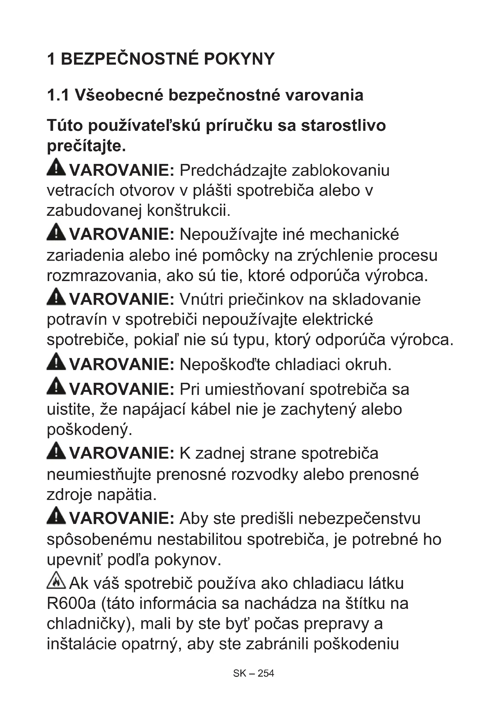 Túto používateľskú príručku sa starostlivo prečítajte. VAROVANIE: Predchádzajte zablokovaniu vetracích otvorov v plášti spotrebiča alebo v zabudovanej konštrukcii. VAROVANIE: Nepoužívajte iné mechanické zariadenia alebo iné pomôcky na zrýchlenie procesu rozmrazovania, ako sú tie, ktoré odporúča výrobca. VAROVANIE: Vnútri priečinkov na skladovanie potravín v spotrebiči nepoužívajte elektrické spotrebiče, pokiaľ nie sú typu, ktorý odporúča výrobca. VAROVANIE: Nepoškoďte chladiaci okruh. VAROVANIE: Pri umiestňovaní spotrebiča sa uistite, že napájací kábel nie je zachytený alebo poškodený. VAROVANIE: K zadnej strane spotrebiča neumiestňujte prenosné rozvodky alebo prenosné zdroje napätia. VAROVANIE: Aby ste predišli nebezpečenstvu spôsobenému nestabilitou spotrebiča, je potrebné ho upevniť podľa pokynov. Ak váš spotrebič používa ako chladiacu látku R600a (táto informácia sa nachádza na štítku na chladničky), mali by ste byť počas prepravy a inštalácie opatrný, aby ste zabránili poškodeniuSK – 255 chladiacich prvkov. R600a je prírodný plyn šetrný k životnému prostrediu, je však výbušný. V prípade úniku z dôvodu poškodenia chladiča presuňte chladničku mimo otvoreného ohňa alebo zdrojov tepla a vyvetrajte miestnosť, v ktorej sa spotrebič nachádza.