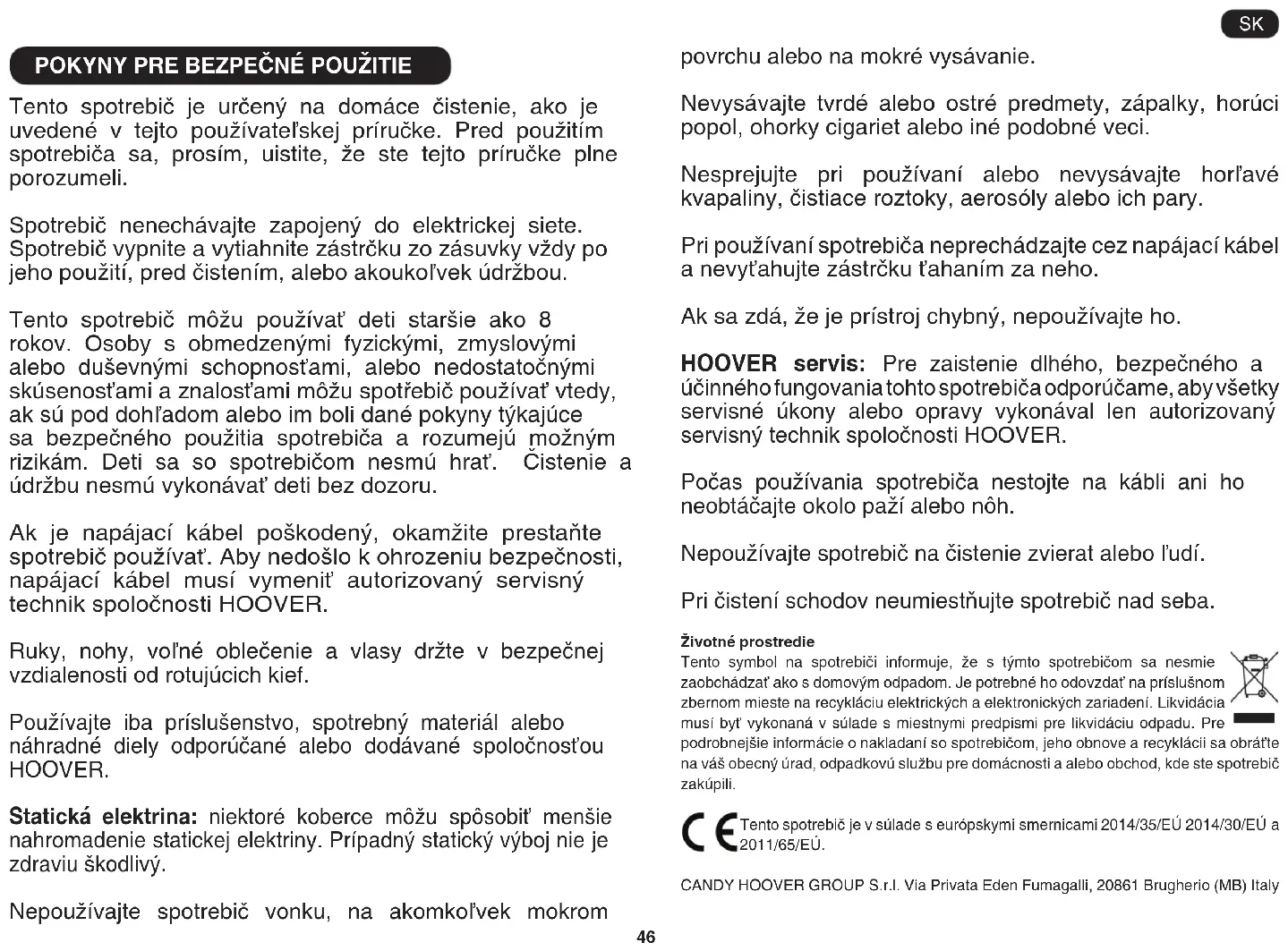 Tento spotrebič je určený na domáce čistenie, ako je uvedené v tejto používateľskej príručke. Pred použitím spotrebiča sa, prosím, uistite, že ste tejto príručke plne porozumeli. Spotrebič nenechávajte zapojený do elektrickej siete. Spotrebič vypnite a vytiahnite zástrčku zo zásuvky vždy po jeho použití, pred čistením, alebo akoukoľvek údržbou. Tento spotrebič môžu používať deti staršie ako 8 rokov. Osoby s obmedzenými fyzickými, zmyslovými alebo duševnými schopnosťami, alebo nedostatočnými skúsenosťami a znalosťami môžu spotřebič používať vtedy, ak sú pod dohľadom alebo im boli dané pokyny týkajúce sa bezpečného použitia spotrebiča a rozumejú možným rizikám. Deti sa so spotrebičom nesmú hrať. Čistenie a údržbu nesmú vykonávať deti bez dozoru. Ak je napájací kábel poškodený, okamžite prestaňte spotrebič používať. Aby nedošlo k ohrozeniu bezpečnosti, napájací kábel musí vymeniť autorizovaný servisný technik spoločnosti HOOVER. Ruky, nohy, voľné oblečenie a vlasy držte v bezpečnej vzdialenosti od rotujúcich kief. Používajte iba príslušenstvo, spotrebný materiál alebo náhradné diely odporúčané alebo dodávané spoločnosťou HOOVER. Statická elektrina: niektoré koberce môžu spôsobiť menšie nahromadenie statickej elektriny. Prípadný statický výboj nie je zdraviu škodlivý. Nepoužívajte spotrebič vonku, na akomkoľvek mokrom povrchu alebo na mokré vysávanie. Nevysávajte tvrdé alebo ostré predmety, zápalky, horúci popol, ohorky cigariet alebo iné podobné veci. Nesprejujte pri používaní alebo nevysávajte horľavé kvapaliny, čistiace roztoky, aerosóly alebo ich pary. Pri používaní spotrebiča neprechádzajte cez napájací kábel a nevyťahujte zástrčku ťahaním za neho. Ak sa zdá, že je prístroj chybný, nepoužívajte ho. HOOVER servis: Pre zaistenie dlhého, bezpečného a účinného fungovania tohto spotrebiča odporúčame, aby všetky servisné úkony alebo opravy vykonával len autorizovaný servisný technik spoločnosti HOOVER. Počas používania spotrebiča nestojte na kábli ani ho neobtáčajte okolo paží alebo nôh. Nepoužívajte spotrebič na čistenie zvierat alebo ľudí. Pri čistení schodov neumiestňujte spotrebič nad seba. Životné prostredie Tento symbol na spotrebiči informuje, že s týmto spotrebičom sa nesmie zaobchádzať ako s domovým odpadom. Je potrebné ho odovzdať na príslušnom zbernom mieste na recykláciu elektrických a elektronických zariadení. Likvidácia musí byť vykonaná v súlade s miestnymi predpismi pre likvidáciu odpadu. Pre podrobnejšie informácie o nakladaní so spotrebičom, jeho obnove a recyklácii sa obráťte na váš obecný úrad, odpadkovú službu pre domácnosti a alebo obchod, kde ste spotrebič zakúpili. Tento spotrebič je v súlade s európskymi smernicami 2014/35/EÚ 2014/30/EÚ a 2011/65/EÚ. CANDY HOOVER GROUP S.r.l. Via Privata Eden Fumagalli, 20861 Brugherio (MB) Italy SK47 *Iba u niektorých modelov **Vzhľad hubice sa môže líšiť v závislosti od modelu