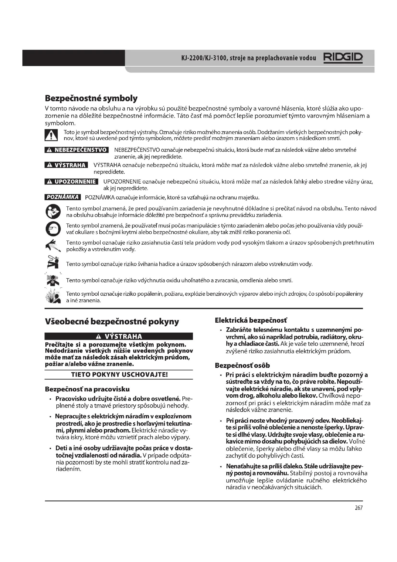 - Pred začiatkom práce si prečítajte a dôkladne sa oboznámte s týmto návodom na obsluhu, s návo- dom na obsluhu motora a s výstrahami a pokyn- mi na obsluhu, ktoré sa týkajú všetkých ďalších použitých zariadení. Chyby pri dodržiavaní výstrah a pokynov môžu mať za následok poškodenie ma- jetku a/alebo vážne zranenia. V prípade potreby bude k tomuto návodu pripojené ES Prehlásenie o zhode (890-011-320.10) ako samostatný materiál. Ak máte akékoľvek otázky, ktoré súvisia s týmto výrob- kom značky RIDGID® : – Obráťte sa na miestneho distribútora značky RIDGID. – Navštívte webové stránky www.RIDGID.com alebo www.RIDGID.eu, kde získate informácie o miest- nom kontaktnom bode pre výrobky značky RIDGID. – Obráťte sa na oddelenie technických služieb spo- ločnosti RIDGID prostredníctvom e-mailu rtctechservices@emerson.com alebo (v USA a Kanade) volajte (800) 519-3456. Popis, technické údaje a štandardné vybavenie Popis Stroje RIDGID® s motorovým pohonom na preplachovanie vodou sú prenosné vysokotlakové preplachovače, ktoré využívajú tlak a prúd vody na čistenie odtokov od mastno- ty, kalu, usadenín a koreňov. Do odtoku sa zavádza pružná a ľahká hadica, ktorá je poháňaná protiprúdovými tryskami na hubici stroja na preplachovanie a pri spätnom navíjaní hadica odstraňuje odpad z potrubia. V zapnutom pulznom režime hadica ľahšie prejde cez problematické ohyby a si- fóny. Všetky stroje sú vybavené benzínovým motorom na pohon piestového čerpadla triplex. Obrázok č. 1 - KJ-2200, vodný preplachovač RukoväťČerpadlo motoraNožný prepínačCievkaSpínač motoraHadica Nožný prepínač Obrázok č. 2 - KJ-3100, stroj na preplachovanie RukoväteCievkaMotorManuálny držiakHadicaČerpadloKJ-2200/KJ-3100, stroje na preplachovanie vodou