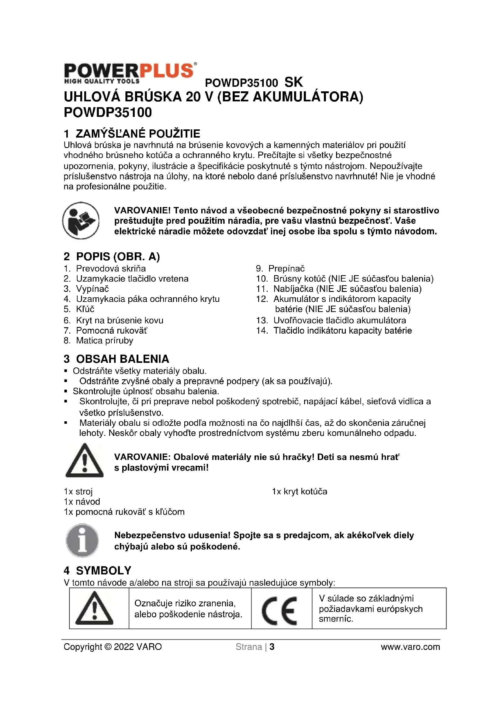 Uhlová brúska je navrhnutá na brusenie kovovych a kamennych materialov pri použití vchodného brúsneho kotuča a ochranného krytu. Precitajte si vsetky bezpečnostné upozornenia,Pokyny, ilustracie a špecifikácie poskytnute s týmto nastrojom. Nepoužívajte prislušenstvo nastroja na ulohy, na ktoré nebolo dané prislušenstvo navrhnute! Nie je vhodné na professionálne použitie.