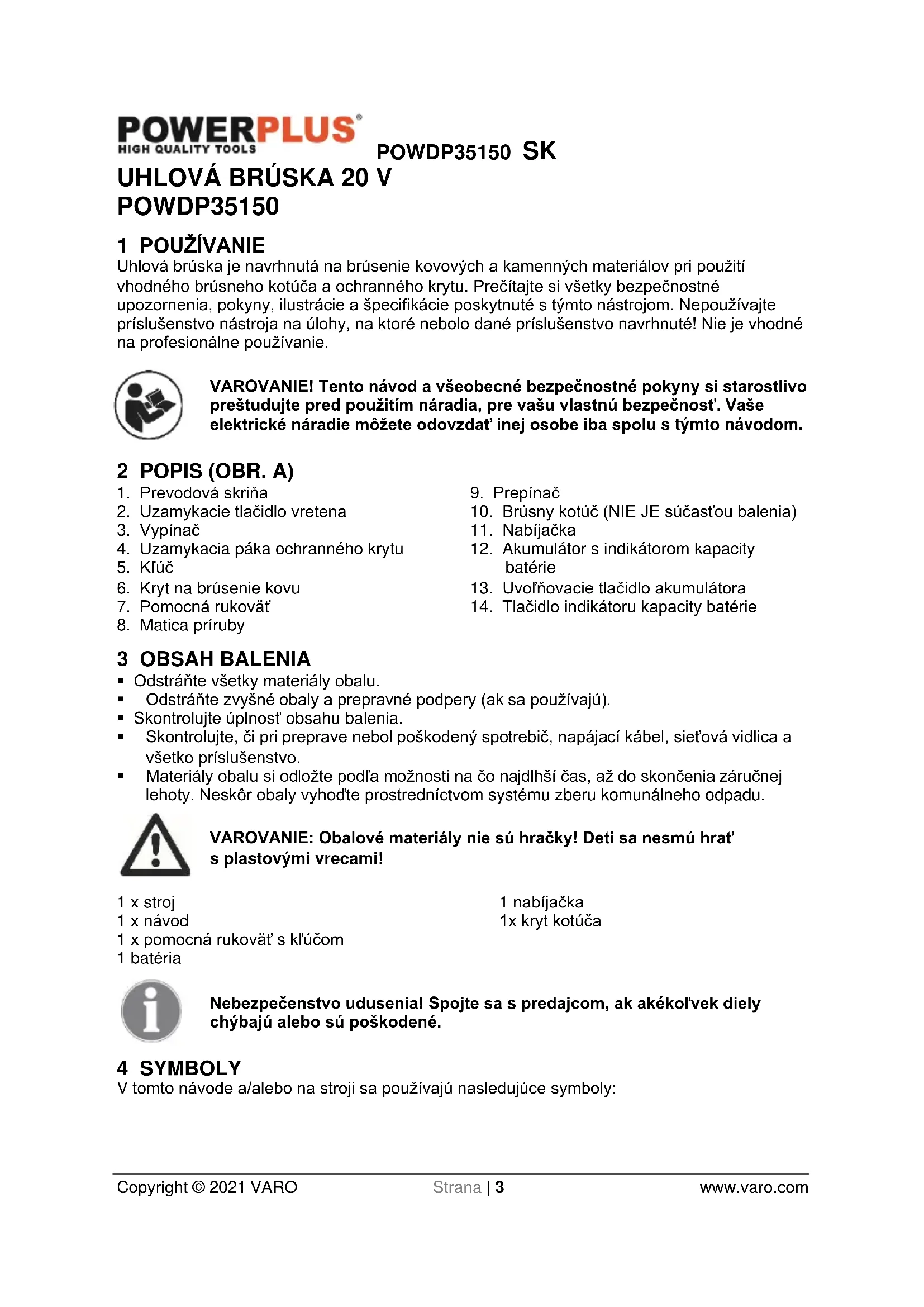- Materiály obalu si odložte podľa možnosti na čo najdlhší čas, až do skončenia záručnej lehoty. Neskôr obaly vyhoďte prostredníctvom systému zberu komunálneho odpadu. VAROVANIE: Obalové materiály nie sú hračky! Deti sa nesmú hrať s plastovými vrecami! 1 x stroj 1 x návod 1 x pomocná rukoväť s kľúčom 1 batéria 1 nabíjačka 1x kryt kotúča Nebezpečenstvo udusenia! Spojte sa s predajcom, ak akékoľvek diely chýbajú alebo sú poškodené. 4 SYMBOLY V tomto návode a/alebo na stroji sa používajú nasledujúce symboly:POWDP35150 SK Copyright © 2021 VARO Strana | 4 www.varo.com