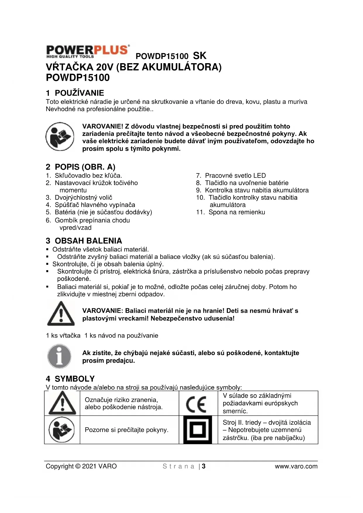 - Ak je akumulátor poškodený, môže z neho vytekať tekutina. Vyhnite sa kontaktu s ňou. Ak dôjde k náhodnému kontaktu s tekutinou, opláchnite zasiahnuté miesto vodou. Ak sa tekutina dostane do očí, vyhľadajte aj lekársku pomoc. Tekutina vytekajúca z akumulátora môže spôsobiť podráždenie alebo popáleniny.POWDP15100 SK Copyright © 2021 VARO S t r a n a | 6 www.varo.com