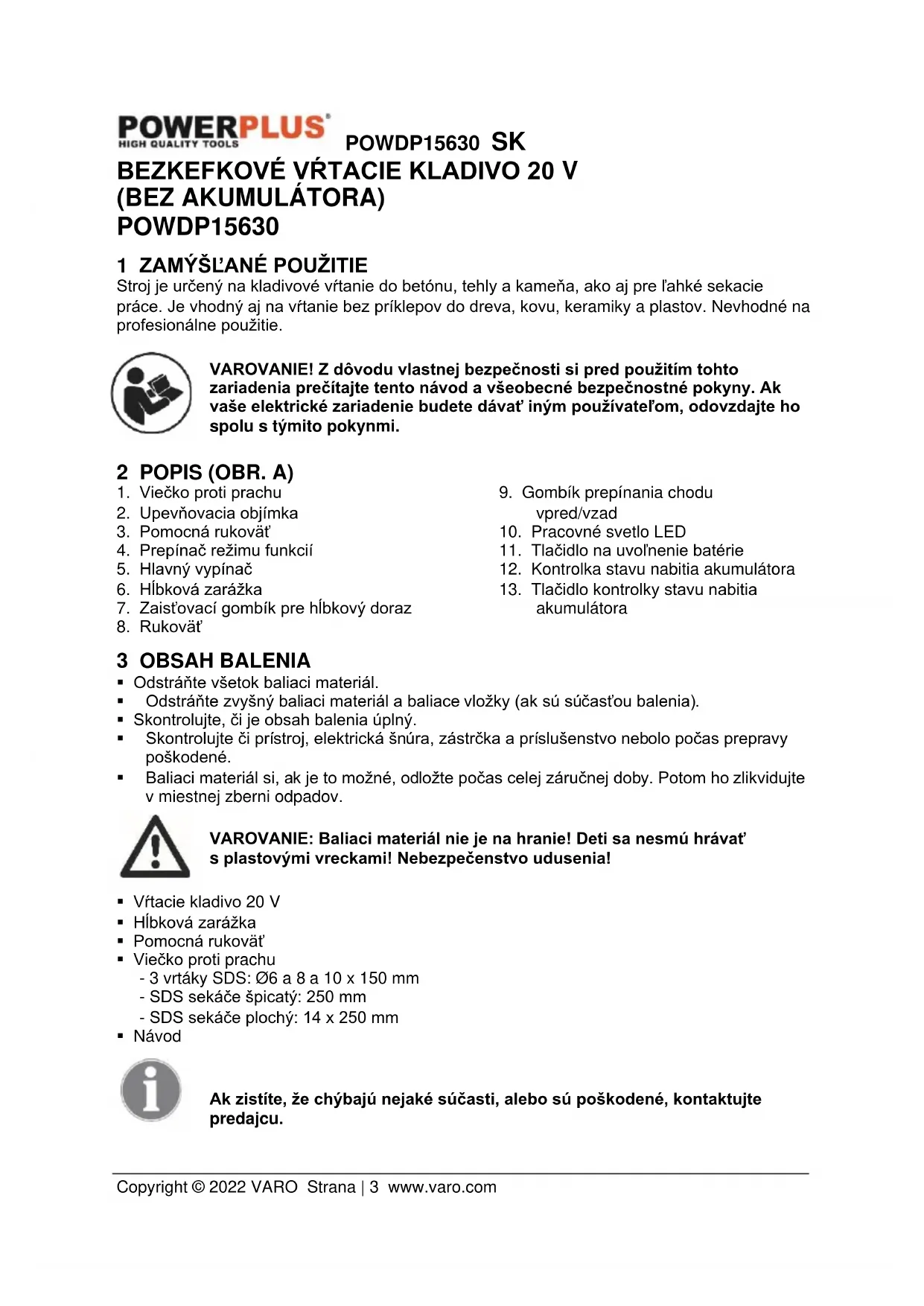 - Elektrické náradie, doplnky a nástrojové koncovky a pod. používajte v súlade s týmito pokynmi a spôsobom, zamýšľaným pre daný druh elektrického náradia, berúc na zreteľ pracovné podmienky a prácu, ktorá sa má vykonávať. Používanie elektrického náradia na iné operácie ako tie, na ktoré je určené, môže spôsobiť nebezpečnú situáciu.POWDP15630 SK Copyright © 2022 VARO Strana | 6 www.varo.com