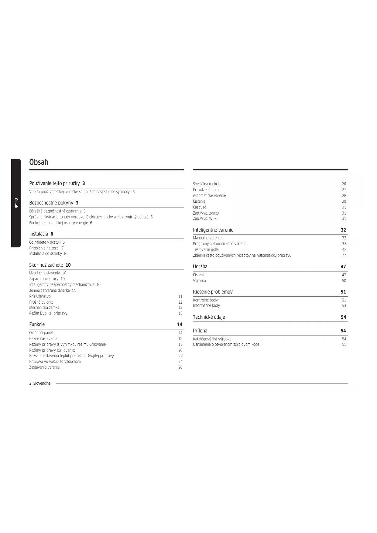 - (opłata według taryfy operatora) http://www.samsung.com/pl/support/ ROMANIA 0800872678 - Apel gratuit *8000 - Apel tarifat în reţea www.samsung.com/ro/support SERBIA 011 321 6899 www.samsung.com/rs/support SLOVAKIA 0800 - SAMSUNG (0800-726 786) www.samsung.com/sk/support LITHUANIA 8-800-77777 www.samsung.com/lt/support LATVIA 8000-7267 www.samsung.com/lv/support ESTONIA 800-7267 www.samsung.com/ee/support SLOVENIA 080 697 267 (brezplačna številka) www.samsung.com/si/support KOSOVO 038 40 30 90 www.samsung.com/support DG68-01413C-01Vstavaná rúra Používateľská a inštalačná príručka NV7B441**** / NV7B442**** / NV7B443**** / NV7B444**** / NV7B445**** / NV7B441**C* / NV7B442**C* / NV7B444**C* / NV7B451**** / NV7B452**** / NV7B453**** / NV7B454**** / NV7B455****2 Slovenčina Obsah Obsah Používanie tejto príručky 3 V tejto používateľskej príručke sú použité nasledujúce symboly: 3 Bezpečnostné pokyny 3 Dôležité bezpečnostné opatrenia 3 Správna likvidácia tohoto výrobku (Elektrotechnický a elektronický odpad) 6 Funkcia automatickej úspory energie 6 Inštalácia 6 Čo nájdete v škatuli 6 Pripojenie na zdroj 7 Inštalácia do skrinky 8 Skôr než začnete 10 Úvodné nastavenia 10 Zápach novej rúry 10 Inteligentný bezpečnostný mechanizmus 10 Jemne zatvárané dvierka 11 Príslušenstvo 11 Pružné dvierka 12 Mechanická zámka 13 Režim Dvojitej prípravy 13 Funkcie 14 Ovládací panel 14 Bežné nastavenia 15 Režimy prípravy (s výnimkou režimu Grilovanie) 18 Režimy prípravy (Grilovanie) 20 Rozsah nastavenia teplôt pre režim Dvojitej prípravy 22 Príprava vo vákuu so vzduchom 24 Zastavenie varenia 26 Špeciálna funkcia 26 Prirodzená para 27 Automatické varenie 28 Čistenie 29 Časovač 31 Zap./Vyp. zvuku 31 Zap./Vyp. Wi-Fi 31 Inteligentné varenie 32 Manuálne varenie 32 Programy automatického varenia 37 Testovacie jedlá 43 Zbierka často používaných receptov na Automatickú prípravu 44 Údržba 47 Čistenie 47 Výmena 50 Riešenie problémov 51 Kontrolné body 51 Informačné kódy 53 Technické údaje 54 Príloha 54 Katalógový list výrobku 54 Oznámenie o otvorenom zdrojovom kóde 55Slovenčina 3 Používanie tejto príručky Bezpečnostné pokyny Montáž tejto rúry môže vykonať jedine vyškolený elektrikár. Inštalatér je zodpovedný za zapojenie spotrebiča k hlavnému napájaciemu zdroju za súčasného dodržania dôležitých bezpečnostných odporúčaní. Dôležité bezpečnostné opatrenia VAROVANIE Tento spotrebič nie je určený na používanie osobami (vrátane detí) s obmedzenými fyzickými, zmyslovými alebo mentálnymi schopnosťami, prípadne s nedostatkom skúseností a vedomostí, kým sa na ne nebude dozerať alebo sa im neposkytnú pokyny o používaní spotrebiča zo strany osoby, ktorá je zodpovedná za ich bezpečnosť. Deti by mali byť pod dohľadom, aby sa zaistilo, že sa nebudú so zariadením hrať. Prostriedky na odpojenie musíte zabudovať do pevného vedenia v súlade s predpismi pre elektroinštaláciu. Spotrebič je potrebné namontovať tak, aby sa dal po montáži ľahko odpojiť od zdroja napájania. Odpojenie je možné zabezpečiť ľahkou dostupnosťou zástrčky alebo zapojením vypínača do napájacieho obvodu v súlade s elektrikárskymi zásadami. Ak je poškodený prívodný kábel, musí ho vymeniť výrobca, jeho servisný agent alebo podobne kvalifikovaná osoba, aby sa predišlo nebezpečenstvu. Používanie tejto príručky Ďakujeme vám za výber vstavanej rúry značky SAMSUNG. Táto používateľská príručka obsahuje dôležité informácie o bezpečnosti a pokyny, ktoré sú určené na to, aby vám pomohli pri prevádzke a údržbe vášho spotrebiča. Nájdite si čas a pred použitím rúry si prečítajte túto používateľskú príručku a uschovajte ju na budúce použitie. V tejto používateľskej príručke sú použité nasledujúce symboly: VAROVANIE Riziká alebo nebezpečné postupy, ktoré môžu spôsobiť vážne ublíženie na zdraví, smrť alebo škody na majetku. UPOZORNENIE Riziká alebo nebezpečné postupy, ktoré môžu spôsobiť ublíženie na zdraví alebo škody na majetku. POZNÁMKA Užitočné tipy, odporúčania alebo informácie, ktoré pomáhajú používateľovi obsluhovať výrobok.4 Slovenčina Bezpečnostné pokyny Bezpečnostné pokyny Nespoliehajte sa na lepidlá ako spôsob upevnenia, keďže sa nepovažujú za spoľahlivé upevňovacie prostriedky. Toto zariadenie môžu používať deti vo veku viac ako 8 rokov, osoby s obmedzenými fyzickými, zmyslovými alebo mentálnymi schopnosťami alebo osoby s nedostatkom skúseností a vedomostí, ak sa na ne bude dozerať alebo ak budú poučené o pokynoch používania zariadenia bezpečným spôsobom a ak porozumejú všetkým možným rizikám. Deti by sa nemali hrať so zariadením. Deti by bez dozoru nemali vykonávať čistenie ani údržbu zariadenia. Spotrebič a kábel udržiavajte mimo dosahu detí mladších ako 8 rokov. Počas používania sa spotrebič zahrieva. Musíte byť opatrní, aby ste sa nedotýkali ohrevných prvkov v rúre. VAROVANIE: Prístupné časti sa môžu počas používania zahriať. K zariadeniu nesmú mať prístup malé deti. Nepoužívajte veľmi drsné čistiace prostriedky alebo ostré kovové stierky, aby ste vyčistili sklo dvierok rúry, pretože môžu poškriabať povrch, čo môže mať za následok rozbitie skla. Ak tento spotrebič obsahuje funkciu čistenia, pred čistením musíte odstrániť všetky rozliatia a počas čistenia parou alebo samočistenia v rúre nenechávajte žiadne riady. Funkcia čistenia závisí od konkrétneho modelu. Ak tento spotrebič obsahuje funkciu samočistenia, počas čistenia môže byť povrch horúcejší než obvykle. Deti preto udržiavajte mimo jeho dosah. V prípade spotrebičov s procesom pyrolytického čistenia môžu byť niektoré zvieratá, najmä vtáky, citlivé na výpary a
