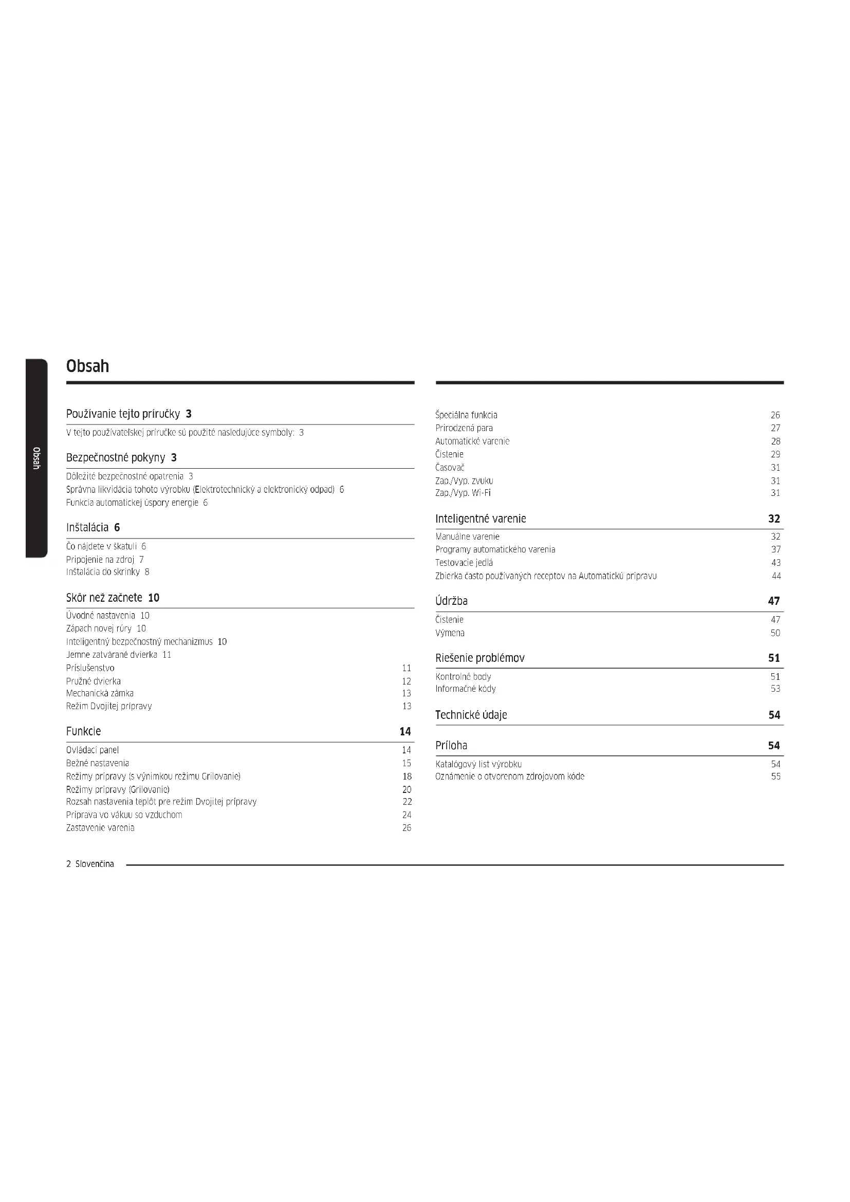 - (opłata według taryfy operatora) http://www.samsung.com/pl/support/ ROMANIA 0800872678 - Apel gratuit *8000 - Apel tarifat în reţea www.samsung.com/ro/support SERBIA 011 321 6899 www.samsung.com/rs/support SLOVAKIA 0800 - SAMSUNG (0800-726 786) www.samsung.com/sk/support LITHUANIA 8-800-77777 www.samsung.com/lt/support LATVIA 8000-7267 www.samsung.com/lv/support ESTONIA 800-7267 www.samsung.com/ee/support SLOVENIA 080 697 267 (brezplačna številka) www.samsung.com/si/support KOSOVO 038 40 30 90 www.samsung.com/support DG68-01413C-01Vstavaná rúra Používateľská a inštalačná príručka NV7B441**** / NV7B442**** / NV7B443**** / NV7B444**** / NV7B445**** / NV7B441**C* / NV7B442**C* / NV7B444**C* / NV7B451**** / NV7B452**** / NV7B453**** / NV7B454**** / NV7B455****2 Slovenčina Obsah Obsah Používanie tejto príručky 3 V tejto používateľskej príručke sú použité nasledujúce symboly: 3 Bezpečnostné pokyny 3 Dôležité bezpečnostné opatrenia 3 Správna likvidácia tohoto výrobku (Elektrotechnický a elektronický odpad) 6 Funkcia automatickej úspory energie 6 Inštalácia 6 Čo nájdete v škatuli 6 Pripojenie na zdroj 7 Inštalácia do skrinky 8 Skôr než začnete 10 Úvodné nastavenia 10 Zápach novej rúry 10 Inteligentný bezpečnostný mechanizmus 10 Jemne zatvárané dvierka 11 Príslušenstvo 11 Pružné dvierka 12 Mechanická zámka 13 Režim Dvojitej prípravy 13 Funkcie 14 Ovládací panel 14 Bežné nastavenia 15 Režimy prípravy (s výnimkou režimu Grilovanie) 18 Režimy prípravy (Grilovanie) 20 Rozsah nastavenia teplôt pre režim Dvojitej prípravy 22 Príprava vo vákuu so vzduchom 24 Zastavenie varenia 26 Špeciálna funkcia 26 Prirodzená para 27 Automatické varenie 28 Čistenie 29 Časovač 31 Zap./Vyp. zvuku 31 Zap./Vyp. Wi-Fi 31 Inteligentné varenie 32 Manuálne varenie 32 Programy automatického varenia 37 Testovacie jedlá 43 Zbierka často používaných receptov na Automatickú prípravu 44 Údržba 47 Čistenie 47 Výmena 50 Riešenie problémov 51 Kontrolné body 51 Informačné kódy 53 Technické údaje 54 Príloha 54 Katalógový list výrobku 54 Oznámenie o otvorenom zdrojovom kóde 55Slovenčina 3 Používanie tejto príručky Bezpečnostné pokyny Montáž tejto rúry môže vykonať jedine vyškolený elektrikár. Inštalatér je zodpovedný za zapojenie spotrebiča k hlavnému napájaciemu zdroju za súčasného dodržania dôležitých bezpečnostných odporúčaní. Dôležité bezpečnostné opatrenia VAROVANIE Tento spotrebič nie je určený na používanie osobami (vrátane detí) s obmedzenými fyzickými, zmyslovými alebo mentálnymi schopnosťami, prípadne s nedostatkom skúseností a vedomostí, kým sa na ne nebude dozerať alebo sa im neposkytnú pokyny o používaní spotrebiča zo strany osoby, ktorá je zodpovedná za ich bezpečnosť. Deti by mali byť pod dohľadom, aby sa zaistilo, že sa nebudú so zariadením hrať. Prostriedky na odpojenie musíte zabudovať do pevného vedenia v súlade s predpismi pre elektroinštaláciu. Spotrebič je potrebné namontovať tak, aby sa dal po montáži ľahko odpojiť od zdroja napájania. Odpojenie je možné zabezpečiť ľahkou dostupnosťou zástrčky alebo zapojením vypínača do napájacieho obvodu v súlade s elektrikárskymi zásadami. Ak je poškodený prívodný kábel, musí ho vymeniť výrobca, jeho servisný agent alebo podobne kvalifikovaná osoba, aby sa predišlo nebezpečenstvu. Používanie tejto príručky Ďakujeme vám za výber vstavanej rúry značky SAMSUNG. Táto používateľská príručka obsahuje dôležité informácie o bezpečnosti a pokyny, ktoré sú určené na to, aby vám pomohli pri prevádzke a údržbe vášho spotrebiča. Nájdite si čas a pred použitím rúry si prečítajte túto používateľskú príručku a uschovajte ju na budúce použitie. V tejto používateľskej príručke sú použité nasledujúce symboly: VAROVANIE Riziká alebo nebezpečné postupy, ktoré môžu spôsobiť vážne ublíženie na zdraví, smrť alebo škody na majetku. UPOZORNENIE Riziká alebo nebezpečné postupy, ktoré môžu spôsobiť ublíženie na zdraví alebo škody na majetku. POZNÁMKA Užitočné tipy, odporúčania alebo informácie, ktoré pomáhajú používateľovi obsluhovať výrobok.4 Slovenčina Bezpečnostné pokyny Bezpečnostné pokyny Nespoliehajte sa na lepidlá ako spôsob upevnenia, keďže sa nepovažujú za spoľahlivé upevňovacie prostriedky. Toto zariadenie môžu používať deti vo veku viac ako 8 rokov, osoby s obmedzenými fyzickými, zmyslovými alebo mentálnymi schopnosťami alebo osoby s nedostatkom skúseností a vedomostí, ak sa na ne bude dozerať alebo ak budú poučené o pokynoch používania zariadenia bezpečným spôsobom a ak porozumejú všetkým možným rizikám. Deti by sa nemali hrať so zariadením. Deti by bez dozoru nemali vykonávať čistenie ani údržbu zariadenia. Spotrebič a kábel udržiavajte mimo dosahu detí mladších ako 8 rokov. Počas používania sa spotrebič zahrieva. Musíte byť opatrní, aby ste sa nedotýkali ohrevných prvkov v rúre. VAROVANIE: Prístupné časti sa môžu počas používania zahriať. K zariadeniu nesmú mať prístup malé deti. Nepoužívajte veľmi drsné čistiace prostriedky alebo ostré kovové stierky, aby ste vyčistili sklo dvierok rúry, pretože môžu poškriabať povrch, čo môže mať za následok rozbitie skla. Ak tento spotrebič obsahuje funkciu čistenia, pred čistením musíte odstrániť všetky rozliatia a počas čistenia parou alebo samočistenia v rúre nenechávajte žiadne riady. Funkcia čistenia závisí od konkrétneho modelu. Ak tento spotrebič obsahuje funkciu samočistenia, počas čistenia môže byť povrch horúcejší než obvykle. Deti preto udržiavajte mimo jeho dosah. V prípade spotrebičov s procesom pyrolytického čistenia môžu byť niektoré zvieratá, najmä vtáky, citlivé na výpary a