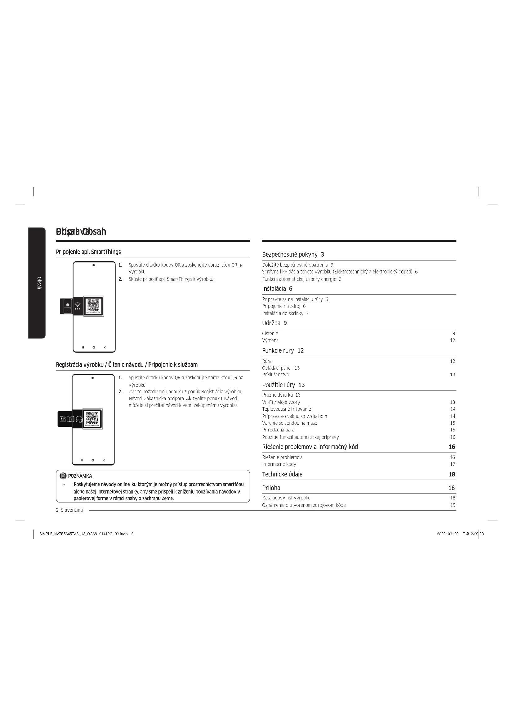 - Pokyny o použití výrobku nájdete v návodoch pre používateľa dostupných prostredníctvom kódu QR alebo na internetovej stránke rmy Samsung Electronics (https://www.samsung.com). Naskenujte tento kód smartfónom. SIMPLE_NV7B5645TAS_U3_DG68-01412C-00.indb 1SIMPLE_NV7B5645TAS_U3_DG68-01412C-00.indb 1 2022-03-29 오후 2:09:292022-03-29 오후 2:09:292 Slovenčina Obsah Obsah Obsah Bezpečnostné pokyny 3 Dôležité bezpečnostné opatrenia 3 Správna likvidácia tohoto výrobku (Elektrotechnický a elektronický odpad) 6 Funkcia automatickej úspory energie 6 Inštalácia 6 Pripravte sa na inštaláciu rúry 6 Pripojenie na zdroj 6 Inštalácia do skrinky 7 Údržba 9 Čistenie 9 Výmena 12 Funkcie rúry 12 Rúra 12 Ovládací panel 13 Príslušenstvo 13 Použitie rúry 13 Pružné dvierka 13 Wi-Fi / Moje vzory 13 Teplovzdušné fritovanie 14 Príprava vo vákuu so vzduchom 14 Varenie so sondou na mäso 15 Prirodzená para 15 Použitie funkcií automatickej prípravy 16 Riešenie problémov a informačný kód 16 Riešenie problémov 16 Informačné kódy 17 Technické údaje 18 Príloha 18 Katalógový list výrobku 18 Oznámenie o otvorenom zdrojovom kóde 19 Príprava Pripojenie apl. SmartThings