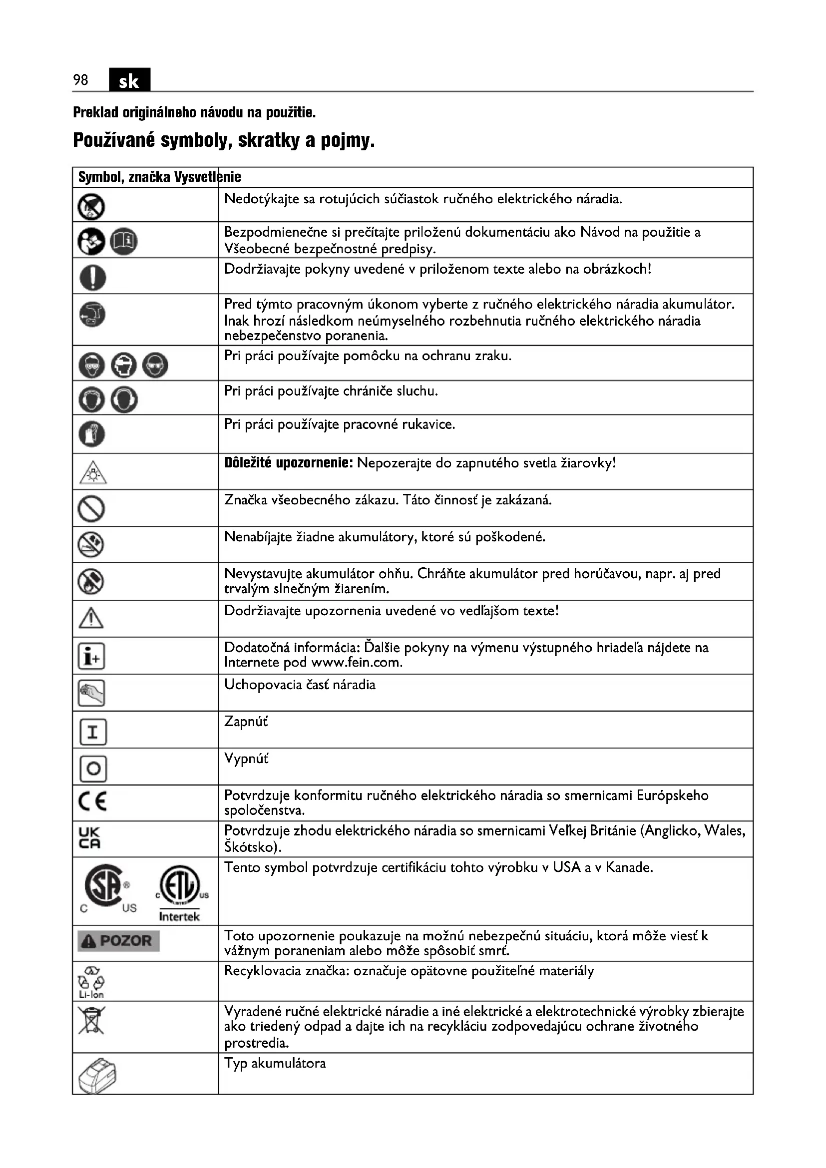Preklad originálneho návodu na použitie. Používané symboly, skratky a pojmy. Symbol, značka Vysvetlenie Nedotýkajte sa rotujúcich súčiastok ručného elektrického náradia. Bezpodmienečne si prečítajte priloženú dokumentáciu ako Návod na použitie a Všeobecné bezpečnostné predpisy. Dodržiavajte pokyny uvedené v priloženom texte alebo na obrázkoch! Pred týmto pracovným úkonom vyberte z ručného elektrického náradia akumulátor. Inak hrozí následkom neúmyselného rozbehnutia ručného elektrického náradia nebezpečenstvo poranenia. Pri práci používajte pomôcku na ochranu zraku. Pri práci používajte chrániče sluchu. Pri práci používajte pracovné rukavice. Dôležité upozornenie: Nepozerajte do zapnutého svetla žiarovky! Značka všeobecného zákazu. Táto činnosť je zakázaná. Nenabíjajte žiadne akumulátory, ktoré sú poškodené. Nevystavujte akumulátor ohňu. Chráňte akumulátor pred horúčavou, napr. aj pred trvalým slnečným žiarením. Dodržiavajte upozornenia uvedené vo vedľajšom texte! Dodatočná informácia: Ďalšie pokyny na výmenu výstupného hriadeľa nájdete na Internete pod www.fein.com. Uchopovacia časť náradia Zapnúť Vypnúť Potvrdzuje konformitu ručného elektrického náradia so smernicami Európskeho spoločenstva. Potvrdzuje zhodu elektrického náradia so smernicami Veľkej Británie (Anglicko, Wales, Škótsko). Tento symbol potvrdzuje certifikáciu tohto výrobku v USA a v Kanade. Toto upozornenie poukazuje na možnú nebezpečnú situáciu, ktorá môže viesť k vážnym poraneniam alebo môže spôsobiť smrť. Recyklovacia značka: označuje opätovne použiteľné materiály Vyradené ručné elektrické náradie a iné elektrické a elektrotechnické výrobky zbierajte ako triedený odpad a dajte ich na recykláciu zodpovedajúcu ochrane životného prostredia. Typ akumulátora99