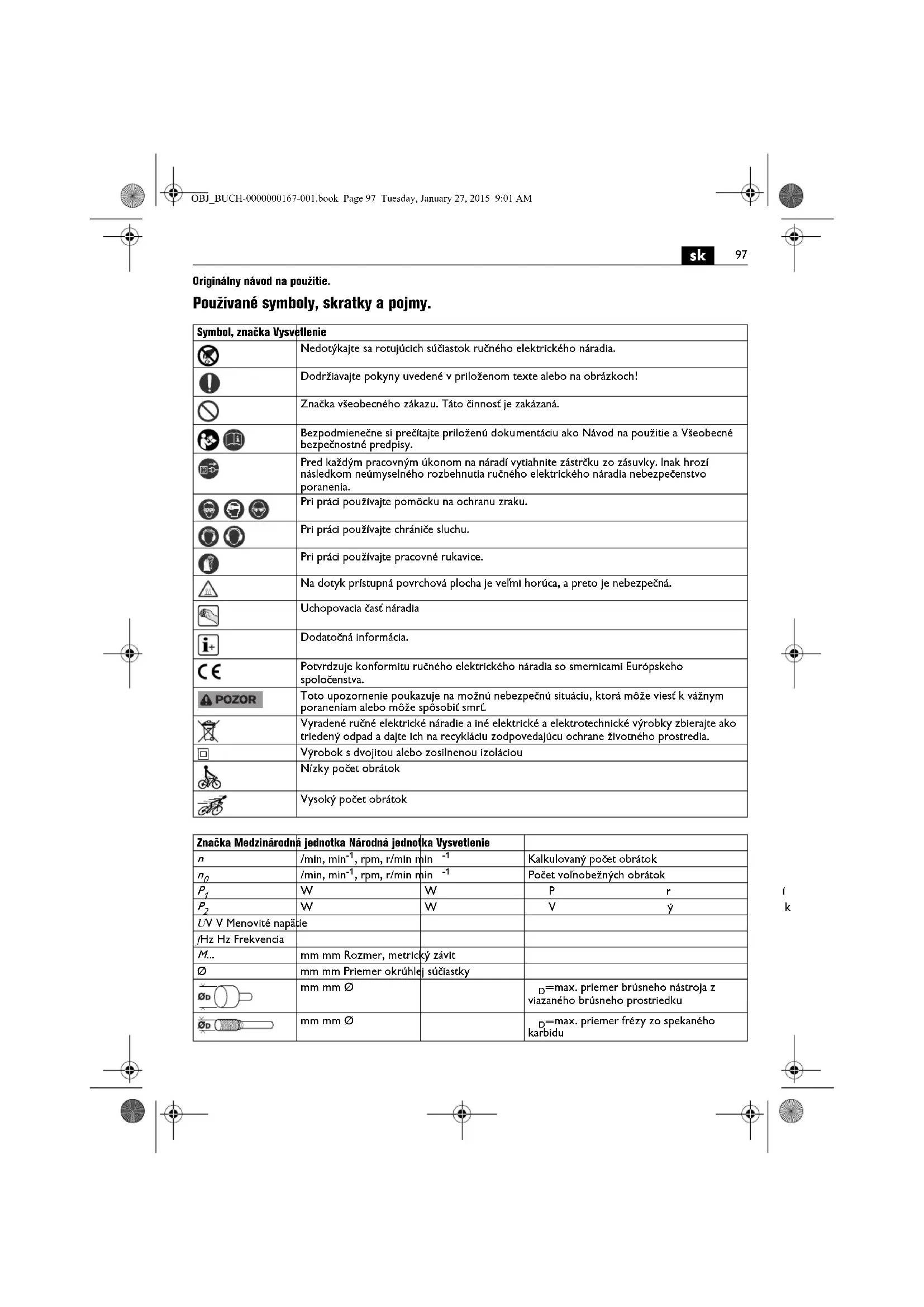 Originálny návod na použitie. Používané symboly, skratky a pojmy. Symbol, značka Vysvetlenie Nedotýkajte sa rotujúcich súčiastok ručného elektrického náradia. Dodržiavajte pokyny uvedené v priloženom texte alebo na obrázkoch! Značka všeobecného zákazu. Táto činnosť je zakázaná. Bezpodmienečne si prečítajte priloženú dokumentáciu ako Návod na použitie a Všeobecné bezpečnostné predpisy. Pred každým pracovným úkonom na náradí vytiahnite zástrčku zo zásuvky. Inak hrozí následkom neúmyselného rozbehnutia ručného elektrického náradia nebezpečenstvo poranenia. Pri práci používajte pomôcku na ochranu zraku. Pri práci používajte chrániče sluchu. Pri práci používajte pracovné rukavice. Na dotyk prístupná povrchová plocha je veľmi horúca, a preto je nebezpečná. Uchopovacia časť náradia Dodatočná informácia. Potvrdzuje konformitu ručného elektrického náradia so smernicami Európskeho spoločenstva. Toto upozornenie poukazuje na možnú nebezpečnú situáciu, ktorá môže viesť k vážnym poraneniam alebo môže spôsobiť smrť. Vyradené ručné elektrické náradie a iné elektrické a elektrotechnické výrobky zbierajte ako triedený odpad a dajte ich na recykláciu zodpovedajúcu ochrane životného prostredia. Výrobok s dvojitou alebo zosilnenou izoláciou Nízky počet obrátok Vysoký počet obrátok Značka Medzinárodná jednotka Národná jednotka Vysvetlenie