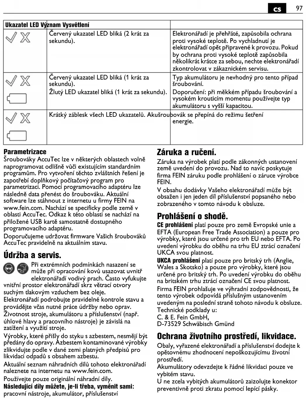 Zákonná záruka a záruka výrobcu. Zákonná záruka na produkt platí podľa zákonných predpisov v krajine uvedenia do prevádzky. Firma FEIN okrem toho poskytuje záruku podľa vyhlásenia výrobcu FEIN o záruke. V základnej výbave Vášho ručného elektrického náradia sa môže nachádzať len časť príslušenstva popísaného alebo zobrazeného v tomto Návode na používanie. Vyhlásenie o konformite. Vyhlásenie CE platí iba pre krajiny Európskej únie a EFTA (European Free Trade Association) a iba pre produkty, ktoré sú určené pre trh EÚ alebo EFTA. Po po uvedení produktu na trh EÚ, stráca značka UKCA svoju platnosť. Vyhlásenie UKCA platí iba pre britský trh (Anglicko, Wales a Škótsko) a iba pre produkty, ktoré sú určené pre britský trh. Po uvedení produktu na britský trh stráca značka CE svoju platnosť. Firma FEIN vyhlasuje na svoju výlučnú zodpovednosť, že tento produkt sa zhoduje s príslušnými normatívnymi dokumentmi uvedenými na poslednej strane tohto Návodu na používanie. Technické podklady sa nachádzajú na adrese: C. & E. Fein GmbH, D-73529 Schwäbisch Gmünd Ochrana životného prostredia, likvidácia. Obaly, výrobky, ktoré doslúžili, a príslušenstvo dajte na recykláciu zodpovedajúcu ochrane životného prostredia. Akumulátory dávajte na predpísanú likvidáciu len vo vybitom stave. V takom prípade, keď nie sú akumulátory úplne vybité, na zabránenie proti skratom zaizolujte ich kontakty pomocou izolačnej pásky.104
