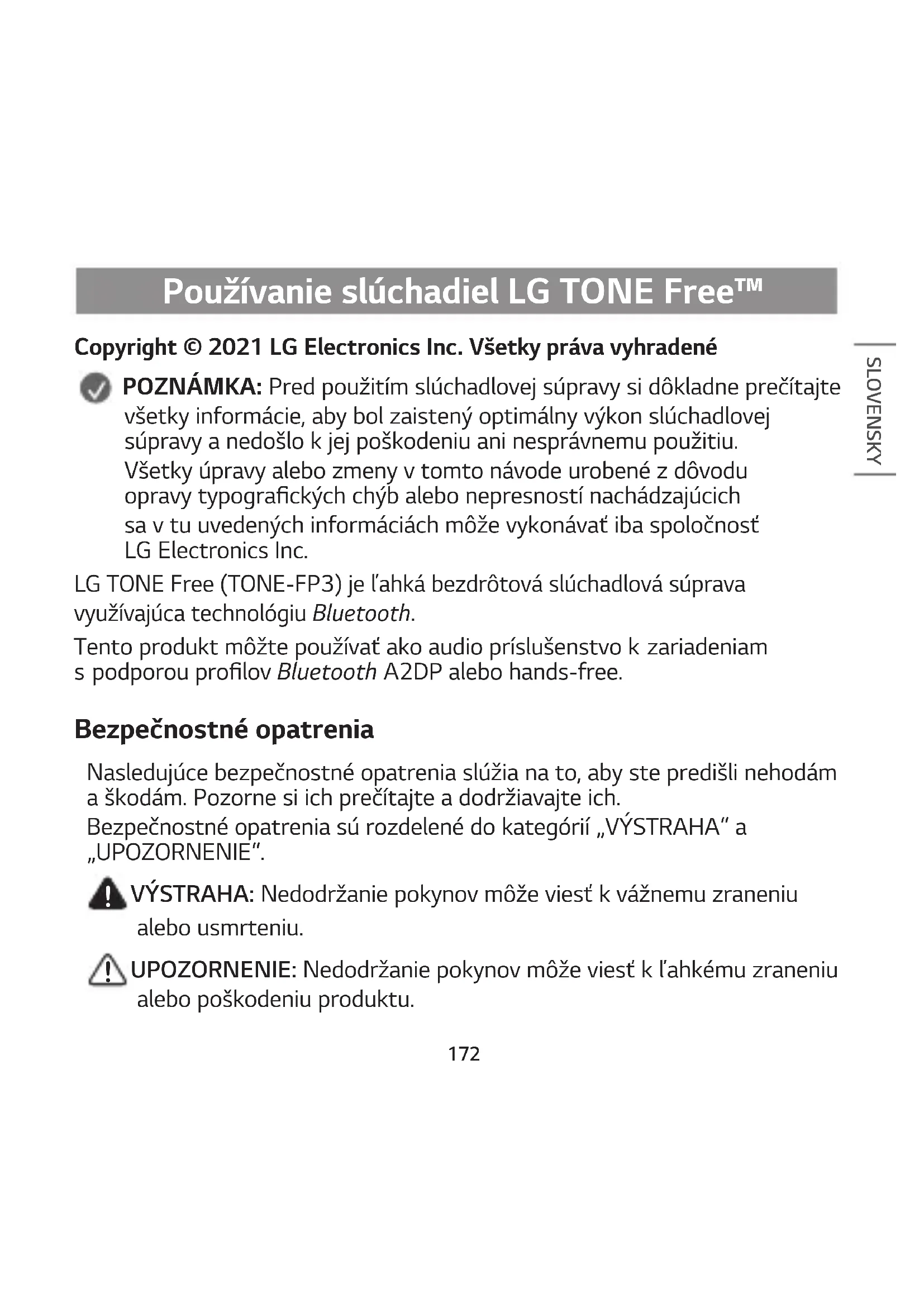 Copyright © 2021 LG Electronics Inc. Všetky práva vyhradené POZNÁMKA: Pred použitím slúchadlovej súpravy si dôkladne prečítajte všetky informácie, aby bol zaistený optimálny výkon slúchadlovej súpravy a nedošlo k jej poškodeniu ani nesprávnemu použitiu. Všetky úpravy alebo zmeny v tomto návode urobené z dôvodu opravy typograckých chýb alebo nepresností nachádzajúcich sa v tu uvedených informáciách môže vykonávať iba spoločnosť LG Electronics Inc. LG TONE Free (TONE-FP3) je ľahká bezdrôtová slúchadlová súprava využívajúca technológiu Bluetooth. Tento produkt môžte používať ako audio príslušenstvo kzariadeniam spodporou prolov Bluetooth A2DP alebo hands-free. Bezpečnostné opatrenia Nasledujúce bezpečnostné opatrenia slúžia na to, aby ste predišli nehodám a škodám. Pozorne si ich prečítajte a dodržiavajte ich. Bezpečnostné opatrenia sú rozdelené do kategórií „VÝSTRAHA“ a „UPOZORNENIE“.
