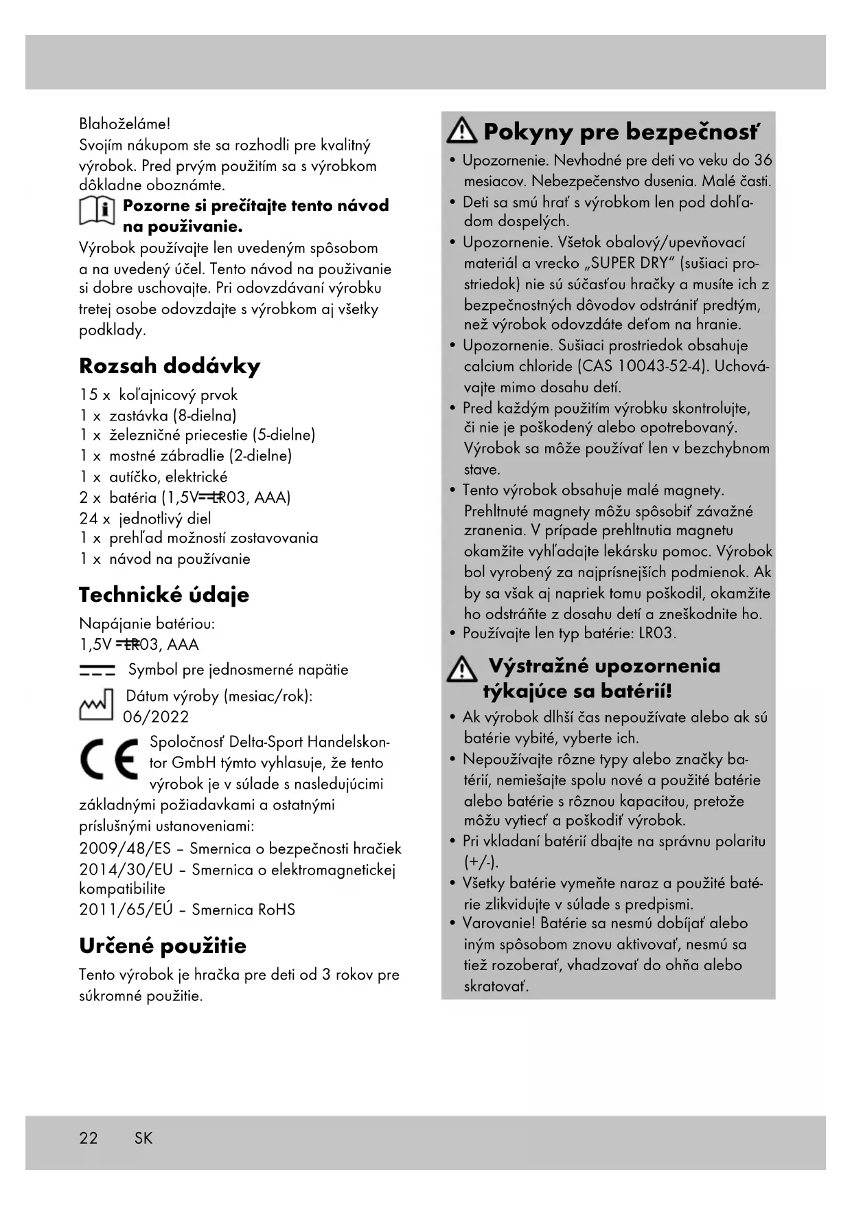 Symbol pre jednosmerné napätie Dátum výroby (mesiac/rok): 06/2022 Spoločnosť Delta-Sport Handelskon- tor GmbH týmto vyhlasuje, že tento výrobok je v súlade s nasledujúcimi základnými požiadavkami a ostatnými príslušnými ustanoveniami: 2009/48/ES – Smernica o bezpečnosti hračiek 2014/30/EU – Smernica o elektromagnetickej kompatibilite 2011/65/EÚ – Smernica RoHS Určené použitie Tento výrobok je hračka pre deti od 3 rokov pre súkromné použitie. Pokyny pre bezpečnosť