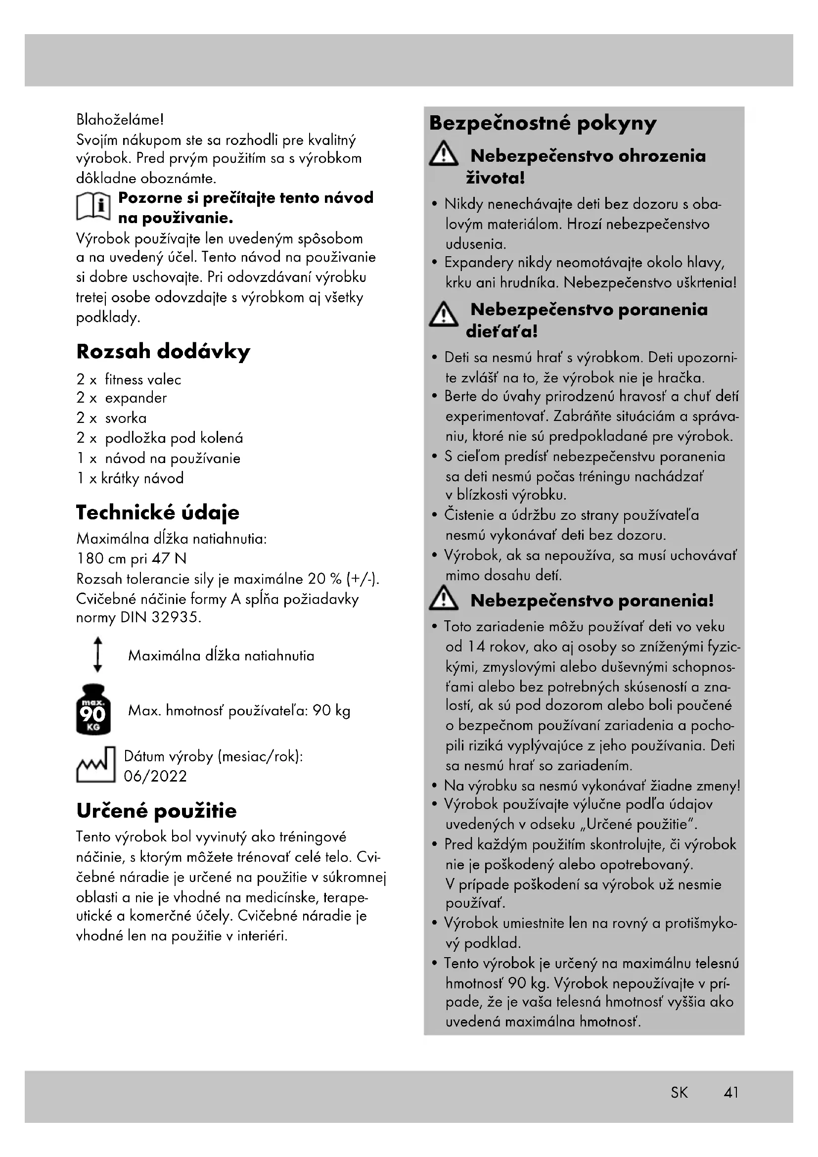Max. hmotnosť používateľa: 90 kg Dátum výroby (mesiac/rok): 06/2022 Určené použitie Tento výrobok bol vyvinutý ako tréningové náčinie, s ktorým môžete trénovať celé telo. Cvi- čebné náradie je určené na použitie v súkromnej oblasti a nie je vhodné na medicínske, terape- utické a komerčné účely. Cvičebné náradie je vhodné len na použitie v interiéri. SK42