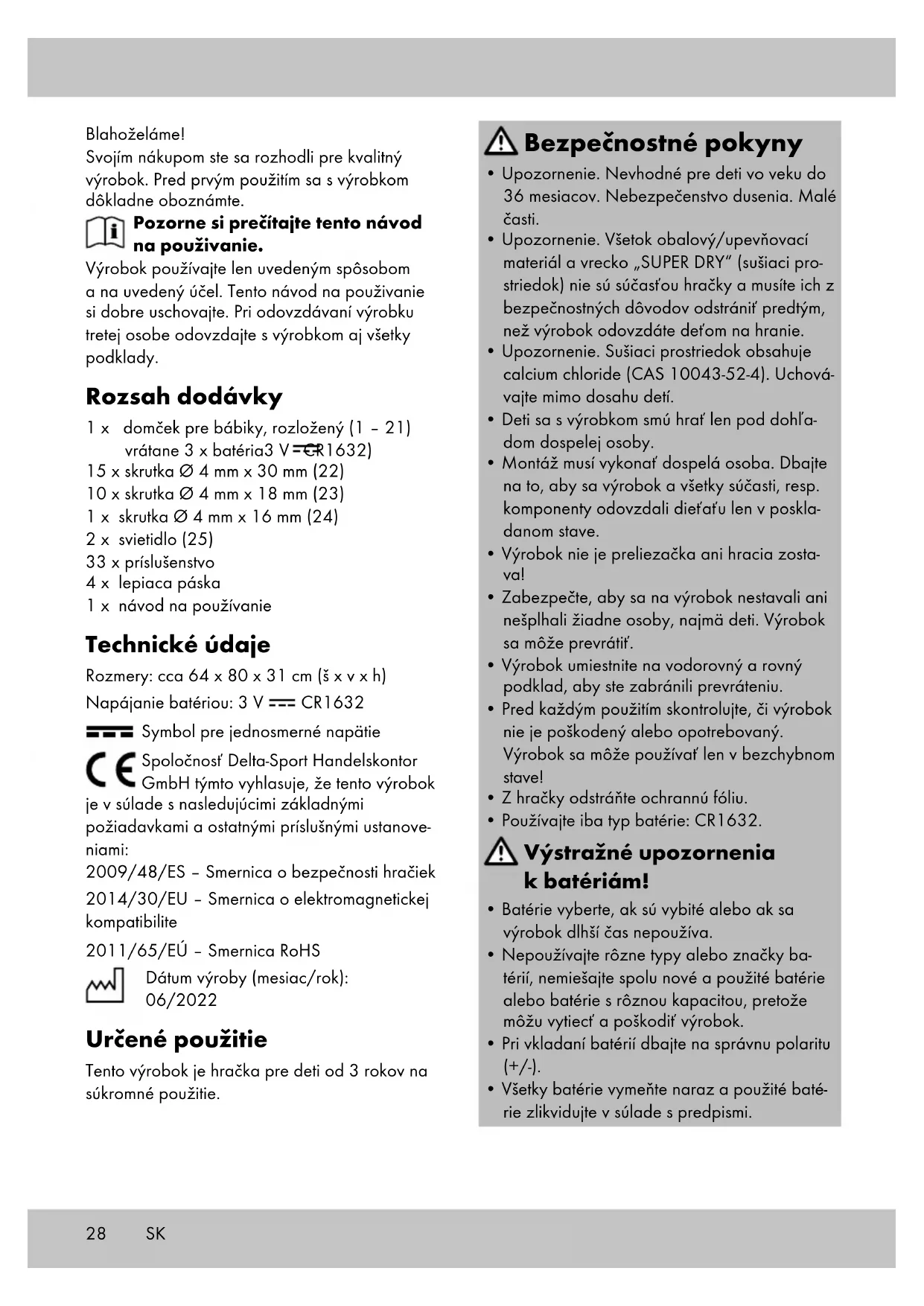 pevne priskrutkujte. Zvonček pripevnite na domček pre bábiky. Skladovanie, čistenie Pri nepoužívaní skladujte výrobok vždy suchý, čistý, bez batérií a pri izbovej teplote. Čistite iba suchou handričkou.30 Textílie čistite len studenou vodou a nechajte ich vyschnúť pri izbovej teplote. DÔLEŽITÉ! Výrobok nikdy nečistite ostrými čistia- cimi prostriedkami. Pokyny k likvidácii V záujme ochrany životného prostredia nevyhadzujte svoj výrobok do domáce- ho odpadu, ak doslúžil, ale odneste ho na špecializovanú likvidáciu. O zber- ných miestach a ich otváracích hodinách sa môžete informovať na vašej príslušnej miestnej správe. Chybné alebo použité batérie/akumulátory sa musia recyklovať v súlade so smernicou 2006/66/ES a jej zmenami. Vráťte batérie/ akumulátory a / alebo výrobok prostredníctvom ponúkaných zberných zariadení. Obalové ma- teriály, ako napr. plastové vrecká, nepatria do rúk deťom. Uchovávajte obalový materiál mimo dosahu detí. Škody na životnom prostredí nesprávnou likvidáciou batérií/akumulátorov! Batérie/akumulátory sa nesmú likvidovať spolu s domovým odpadom. Môžu obsahovať toxické ťažké kovy a podliehajú spracovaniu špeciálneho odpadu. Chemické symboly ťažkých kovov sú nasledovné: Cd = kadmium, Hg = ortuť, Pb = olovo. Použité batérie/akumulátory preto odovzdajte v komunálnom zbernom mieste. Výrobok a obal zlikvidujte ekologickým spôsobom. Pri triedení odpadu dodržiavajte označenie obalových materiálov, ktoré sú označené skratkami (a) a číslami (b) s nasledujúcim významom: 1 – 7: plasty/20 – 22: papier a lepenka/ 80 – 98: kompozitné látky. Výrobok a obalové materiály sú recyklovateľné, likvidujte tieto oddelene pre lepšie spracovanie odpadu. Logo Triman je len pre Francúzsko. Možnosti likvidácie doslúženého výrobku sa dozviete na vašej správe obci alebo mesta. Pokyny k záruke a priebehu servisu Výrobok bol vyrobený veľmi starostlivo a pod stálou kontrolou. Na tento výrobok poskytuje DELTA-SPORT HANDELSKONTOR GmbH súk- romným koncovým užívateľom trojročnú záruku odo dňa kúpy (záručná lehota) po splnení nasle- dovných podmienok. Záruka platí len na chyby materiálu a spracovania. Záruka sa netýka dielov, ktoré podliehajú bežnému opotrebeniu a preto ich možno považovať za opotrebiteľné diely (napr. batérie), ako aj krehkých dielov, napr. vypínače, akumulátory alebo diely, ktoré sú vyrobené zo skla. Nároky z tejto záruky zanikajú, keď sa výrobok používal neodborne alebo nesprávne, mimo určenia na používanie alebo určeného rozsahu používania alebo neboli dodržané pokyny návodu na obsluhu, s výnimkou, že koncový uží- vateľ preukáže, že ide o chybu materiálu alebo spracovania, ktorá nebola spôsobená niektorou z hore uvedených okolností. Záruku je možné uplatniť len počas záručnej lehoty po predložení originálu pokladničného dokladu. Originál pokladničného dokladu preto prosím uschovajte. Záručná doba sa kvôli prípadným záručným opravám, zákonnej záruke alebo ako obchodné gesto nepredlžuje. Platí to aj pre vymenené a opravené diely. Pri reklamáciách sa prosím najskôr obráťte na dole uvedenú Service-Hotline alebo sa s nami spojte prostredníctvom e-mailu. Ak sa jedná o záručný prípad, výrobok – podľa našej voľby – bezplatne opravíme, vymeníme alebo vrátime kúpnu cenu. Ďalšie práva zo záruky nevyplý- vajú. Vaše zákonné práva, hlavne nároky na záručné plnenie voči príslušnému predajcovi, nie sú touto zárukou obmedzené. IAN: 393053_2201 Servis Slovensko Tel.: 0850 232001 E-Mail: deltasport@lidl.sk SK31 ¡Enhorabuena! Con su compra se ha decidido por un artículo de gran calidad. Familiarícese con el artículo antes de usarlo por primera vez. Para ello, lea detenidamente las siguientes instrucciones de uso. Use el artículo solo de la forma descrita y para los campos de aplicación indicados. Conserve estas instrucciones de uso a buen recaudo. Entregue todos los documentos en caso de traspasar el artículo a terceros. Alcance de suministro 1 casa de muñecas desmontada (1-21) incl. 3 pilas (3 V CR1632) 15 tornillos Ø 4 mm x 30 mm (22) 10 tornillos Ø 4 mm x 18 mm (23) 1 tornillo Ø 4 mm x 16 mm (24) 2 lámparas (25) 33 accesorios 4 cintas adhesivas 1 instrucciones de uso Datos técnicos Dimensiones: aprox. 64 x 80 x 31 cm (An x Al x Pr) Alimentación de energía por pila: 3 V CR1632 Símbolo de tensión continua Por la presente, Delta-Sport Handelskon- tor GmbH declara que este artículo cumple con los siguientes requisitos básicos y las disposiciones pertinentes: 2009/48/CE – Directiva sobre la seguridad de los juguetes 2014/30/UE – Directiva CEM 2011/65/UE – Directiva RoHS Fecha de fabricación (mes/año): 06/2022 Uso previsto Este artículo es un juguete para niños a partir de 3 años de edad para su uso privado. Indicaciones de seguridad