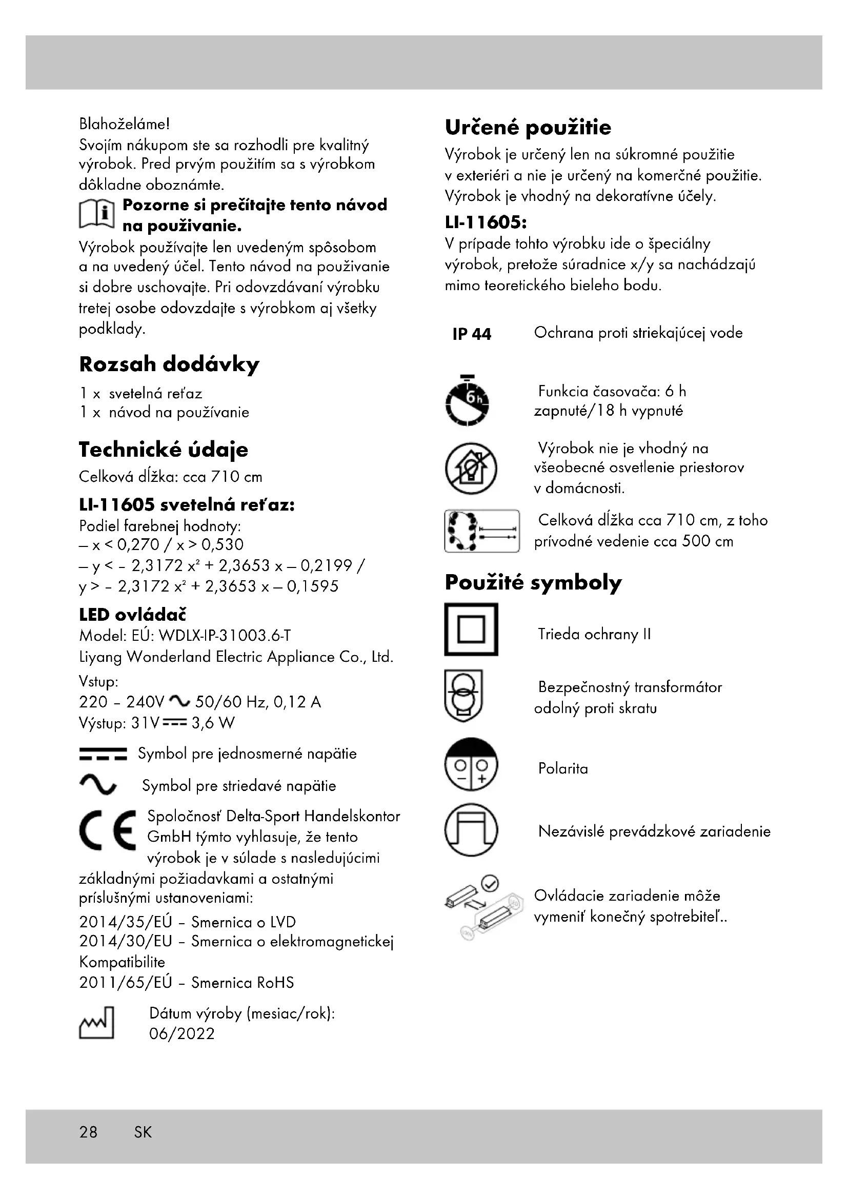 tlačidlo. Skladovanie, čistenie Pri nepoužívaní skladujte výrobok vždy suchý a čistý pri izbovej teplote. Čistite len vlhkou čistiacou handričkou a nakoniec utrite dosucha. Zástrčka sa nesmie počas čistenia namočiť. DÔLEŽITÉ! Výrobok nikdy nečistite ostrými čistia- cimi prostriedkami. Pokyny k likvidácii Vedľa uvedený symbol znázorňuje, že tento prístroj podlieha smernici 2012/19/EÚ. Táto smernica oznamuje, že tento výrobok nesmiete na konci jeho doby používania likvidovať spolu s bežným domácim odpadom, ale ho musíte odovzdať v špeciálne zriadených zberných dvoroch, recyklačných centrách alebo likvidačných prevádzkach. Chráňte životné prostredie a likvidujte odborne. Batérie/akumulátory sa nesmú likvidovať spolu s domovým odpadom. Môžu obsahovať toxické ťažké kovy a podliehajú spracovaniu špeciálne- ho odpadu. Chemické symboly ťažkých kovov sú nasledovné: Cd = kadmium, Hg = ortuť, Pb = olovo. Použité batérie/akumulátory preto odovzdajte v komunálnom zbernom mieste. Ďalšie informácie o možnostiach likvidácie zastaraného prístroja dostanete na svojej obecnej alebo mestskej správe. Prístroj a obal zlikvidujte ekologicky. Obalový materiál (ako napr. fóliové vrecká) uschovajte mimo dosahu detí. Pri triedení odpadu dodržiavajte označenie obalových materiálov, ktoré sú označené skratkami (a) a číslami (b) s nasledujúcim významom: 1 – 7: plasty / 20 – 22: papier a lepenka / 80 – 98: kompo- zitné látky. Výrobok a obalové materiály sú recyklovateľné, likvidujte tieto oddelene pre lepšie spracovanie odpadu. Logo Triman je len pre Francúzsko. Pokyny k záruke a priebehu servisu Výrobok bol vyrobený veľmi starostlivo a pod stálou kontrolou. Na tento výrobok poskytuje DELTA-SPORT HANDELSKONTOR GmbH súk- romným koncovým užívateľom trojročnú záruku odo dňa kúpy (záručná lehota) po splnení nasle- dovných podmienok. Záruka platí len na chyby materiálu a spracovania. Záruka sa netýka dielov, ktoré podliehajú bežnému opotrebeniu a preto ich možno považovať za opotrebiteľné diely (napr. batérie), ako aj krehkých dielov, napr. vypínače, akumulátory alebo diely, ktoré sú vyrobené zo skla. Nároky z tejto záruky zanikajú, keď sa výrobok používal neodborne alebo nesprávne, mimo určenia na používanie alebo určeného rozsahu používania alebo neboli dodržané pokyny návodu na obsluhu, s výnimkou, že koncový uží- vateľ preukáže, že ide o chybu materiálu alebo spracovania, ktorá nebola spôsobená niektorou z hore uvedených okolností. Záruku je možné uplatniť len počas záručnej lehoty po predložení originálu pokladničného dokladu. Originál pokladničného dokladu preto prosím uschovajte. Záručná doba sa kvôli prípadným záručným opravám, zákonnej záruke alebo ako obchodné gesto nepredlžuje. Platí to aj pre vymenené a opravené diely. Pri reklamáciách sa prosím najskôr obráťte na dole uvedenú Service-Hotline alebo sa s nami spojte prostredníctvom e-mailu. Ak sa jedná o záručný prípad, výrobok – podľa našej voľby – bezplatne opravíme, vymeníme alebo vrátime kúpnu cenu. Ďalšie práva zo záruky nevyplý- vajú. Vaše zákonné práva, hlavne nároky na záručné plnenie voči príslušnému predajcovi, nie sú touto zárukou obmedzené. IAN: 414553_2201 Servis Slovensko Tel.: 0850 232001 E-Mail: deltasport@lidl.sk SK31SK Doplňujúce informácie podľa nariadenia 2019/2020/EÚ maximálny výstupný výkon ovládacieho zariadenia 3,6 W Druh svetelného zdroja, pre ktorý je ovládacie zariadenie určené: LED Stupeň účinnosti pri plnom zaťažení 81% Príkon v chode naprázdno (P