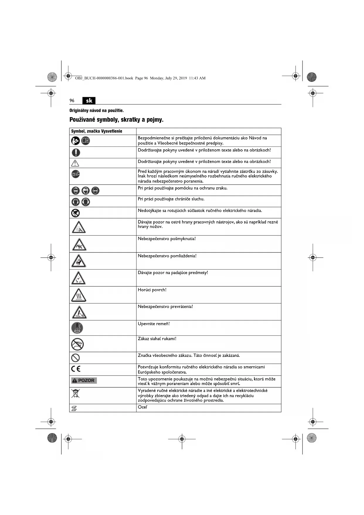 Originálny návod na použitie. Používané symboly, skratky a pojmy. Symbol, značka Vysvetlenie Bezpodmienečne si prečítajte priloženú dokumentáciu ako Návod na použitie a Všeobecné bezpečnostné predpisy. Dodržiavajte pokyny uvedené v priloženom texte alebo na obrázkoch! Dodržiavajte pokyny uvedené v priloženom texte alebo na obrázkoch! Pred každým pracovným úkonom na náradí vytiahnite zástrčku zo zásuvky. Inak hrozí následkom neúmyselného rozbehnutia ručného elektrického náradia nebezpečenstvo poranenia. Pri práci používajte pomôcku na ochranu zraku. Pri práci používajte chrániče sluchu. Nedotýkajte sa rotujúcich súčiastok ručného elektrického náradia. Dávajte pozor na ostré hrany pracovných nástrojov, ako sú napríklad rezné hrany nožov. Nebezpečenstvo pošmyknutia! Nebezpečenstvo pomliaždenia! Dávajte pozor na padajúce predmety! Horúci povrch! Nebezpečenstvo prevrátenia! Upevnite remeň! Zákaz siahať rukami! Značka všeobecného zákazu. Táto činnosť je zakázaná. Potvrdzuje konformitu ručného elektrického náradia so smernicami Európskeho spoločenstva. Toto upozornenie poukazuje na možnú nebezpečnú situáciu, ktorá môže viesť k vážnym poraneniam alebo môže spôsobiť smrť. Vyradené ručné elektrické náradie a iné elektrické a elektrotechnické výrobky zbierajte ako triedený odpad a dajte ich na recykláciu zodpovedajúcu ochrane životného prostredia. Oceľ OBJ_BUCH-0000000386-001.book Page 96 Monday, July 29, 2019 11:43 AM97