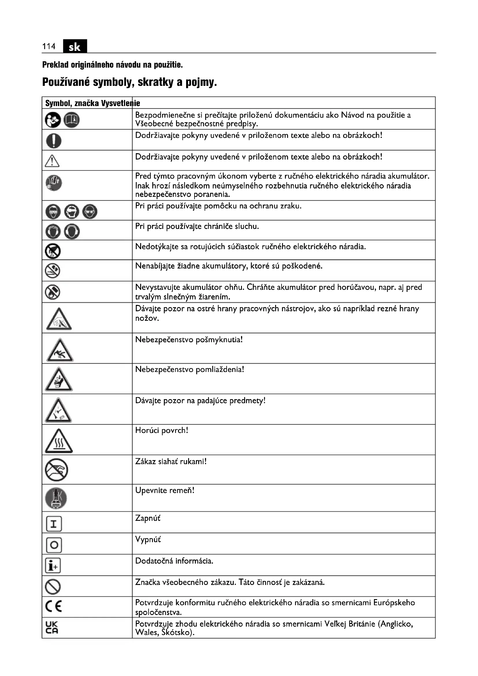 Preklad originálneho návodu na použitie. Používané symboly, skratky a pojmy. Symbol, značka Vysvetlenie Bezpodmienečne si prečítajte priloženú dokumentáciu ako Návod na použitie a Všeobecné bezpečnostné predpisy. Dodržiavajte pokyny uvedené v priloženom texte alebo na obrázkoch! Dodržiavajte pokyny uvedené v priloženom texte alebo na obrázkoch! Pred týmto pracovným úkonom vyberte z ručného elektrického náradia akumulátor. Inak hrozí následkom neúmyselného rozbehnutia ručného elektrického náradia nebezpečenstvo poranenia. Pri práci používajte pomôcku na ochranu zraku. Pri práci používajte chrániče sluchu. Nedotýkajte sa rotujúcich súčiastok ručného elektrického náradia. Nenabíjajte žiadne akumulátory, ktoré sú poškodené. Nevystavujte akumulátor ohňu. Chráňte akumulátor pred horúčavou, napr. aj pred trvalým slnečným žiarením. Dávajte pozor na ostré hrany pracovných nástrojov, ako sú napríklad rezné hrany nožov. Nebezpečenstvo pošmyknutia! Nebezpečenstvo pomliaždenia! Dávajte pozor na padajúce predmety! Horúci povrch! Zákaz siahať rukami! Upevnite remeň! Zapnúť Vypnúť Dodatočná informácia. Značka všeobecného zákazu. Táto činnosť je zakázaná. Potvrdzuje konformitu ručného elektrického náradia so smernicami Európskeho spoločenstva. Potvrdzuje zhodu elektrického náradia so smernicami Veľkej Británie (Anglicko, Wales, Škótsko).115