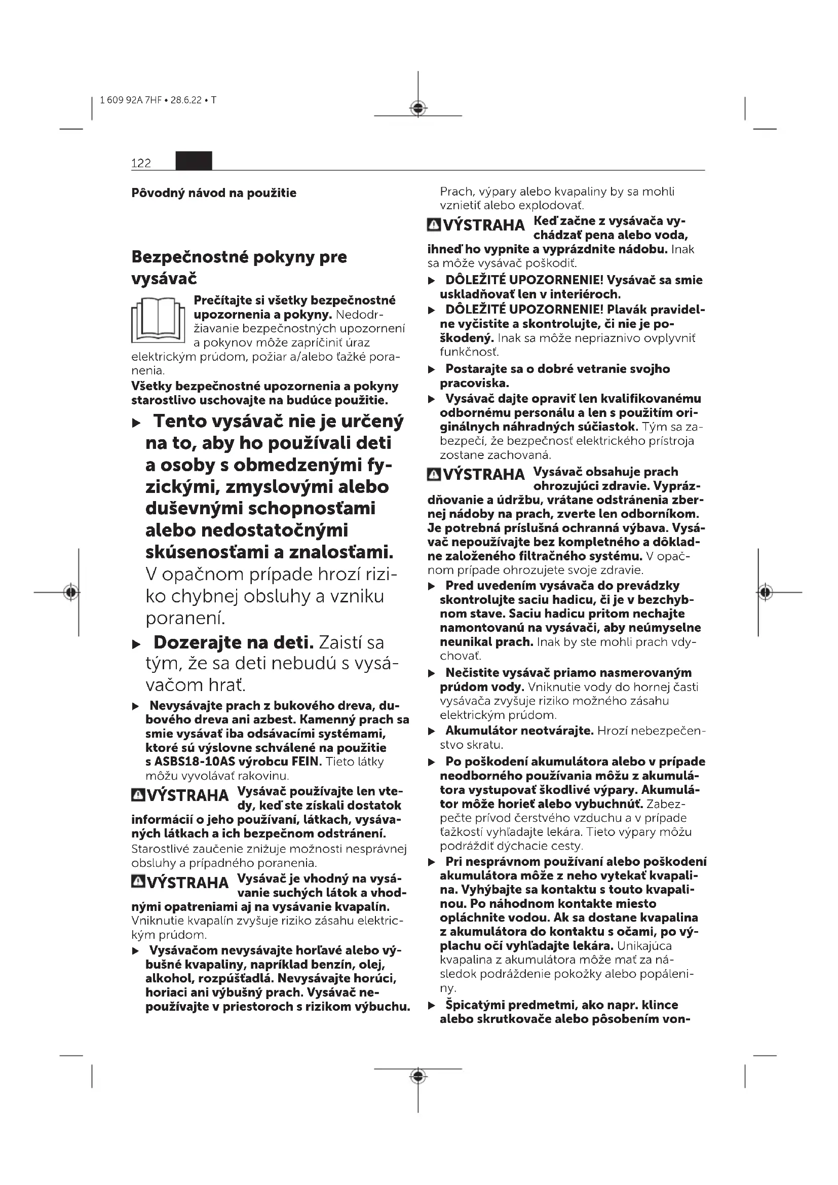 MontážSlovenčina u Odstráňte akumulátor predtým, než budete vysávač čistiť alebo vykonávať jeho údržbu, vykonávať nastavenia zariadenia, meniť časti príslušenstva alebo pred skladovaním vysávača. Toto preventívne opatrenie za- braňuje neúmyselnému spusteniu vysávača. Nabíjanie akumulátorovSlovenčina u Používajte len nabíjačky uvedené vtech- nických údajoch. Len tieto nabíjačky sú pris- 124 sk 1 609 92A 7HF • 28.6.22 • Tpôsobené na lítiovo-iónový akumulátor použí- vaný vo vašom vysávači. Upozornenie: Lítiovo-iónové akumulátory sa na základe medzinárodných dopravných predpisov dodávajú čiastočne nabité. Aby ste zaručili plný výkon akumulátora, pred prvým použitím ho úpl- ne nabite. u Po automatickom vypnutí vysávača už ďalej nestláčajte tlačidlo vypínača. Akumulátor sa môže poškodiť. Výrazne skrátená výdrž akumulátora po nabití signalizuje, že akumulátor je opotrebovaný atreba ho vymeniť za nový. Dodržiavajte upozornenia týkajúce sa likvidácie. Indikácia stavu nabitia akumulátoraSlovenčina Pri vloženom akumulátore môžete stav nabitia zistiť na indikácii stavu nabitia akumulátora(4) vysávača. Ak je akumulátor vybratý, na samot- nom akumulátore. Indikácia stavu nabitia akumulátora na vysávačiSlovenčina Po zapnutí vysávača sa jednotlivo rozsvieti, stú- pajúc aklesajúc, 5 zelených LED kontroliek indi- kácie stavu nabitia akumulátora(4). Potom LED kontrolky zobrazujú stav nabitia akumulátora(19). Indikácia stavu nabitia akumulátora na akumulátoreSlovenčina Keď sa vyberie akumulátor zvysávača, stav nabi- tia sa môže zobraziť zelenými LED indikáciami stavu nabitia na akumulátore. Stlačte tlačidlo pre indikáciu stavu nabitia alebo , aby sa zobrazil stav nabitia. Ak po stlačení tlačidla indikácie stavu nabitia ne- svieti žiadna LED kontrolka, akumulátor je chyb- ný amusí sa vymeniť. Typ akumulátora GBA 18V...Slovenčina LED kontrolky Kapacita Neprerušované svetlo 3× zelená 60−100% Neprerušované svetlo 2× zelená 30−60% Neprerušované svetlo 1× ze- lená 5−30% Blikanie 1× zelená 0−5% Typ akumulátora ProCORE18V...Slovenčina LED kontrolky Kapacita Neprerušované svetlo 5× zelených 80–100 % Neprerušované svetlo 4× zelené 60–80 % Neprerušované svetlo 3× zelené 40–60 % Neprerušované svetlo 2× zelené 20–40 % Neprerušované svetlo 1× ze- lená 5–20 % Blikanie 1× zelená 0–5 % Vkladanie avyberanie akumulátora (pozri obrázkyA1−A2)Slovenčina u Pri vkladaní akumulátora nepoužívajte ne- primeranú silu. Akumulátor je skonštruovaný tak, aby sa dal vsunúť do produktu len vsprávnej polohe. u Priehradku na akumulátor ašachtu na akumu- látor udržiavajte vždy včistote, aby ste mohli pracovať kvalitne abezpečne. – Stlačte odblokovacie tlačidlo (10) na otvorenie veka priehradky na akumulátor (11). – Zasúvajte akumulátor (19) do šachty na aku- mulátor (18), kým sa počuteľne nezaistí. – Na vybratie akumulátora (19) stlačte od- blokovacie tlačidlo (20) na akumulátore avy- berte akumulátor zo šachty (18). – Zatvorte veko priehradky na akumulátor (11). Montáž držiaka sacieho príslušenstva (pozriobrázokB)Slovenčina – Zasuňte držiak (21) pre saciu hadicu aštrbi- novú dýzu zhora do určeného uchytenia (9) tak, aby zapadol. – Zasuňte držiak (23) pre saciu hadicu apodla- hovú dýzu zhora do určeného uchytenia (7) autiahnite upevňovaciu skrutku (22). Montáž sacej hadice (pozri obrázok C)Slovenčina – Vsuňte saciu hadicu (12) do uchytenia hadice (8) tak, aby obidva stláčacie gombíky (24) sa- cej hadice zapadli. Upozornenie: Pri vysávaní vzniká trením prachu vsacej hadici apríslušenstve elektrostatický náboj, ktorý môže používateľ pocítiť vo forme statického výboja (vzávislosti od vplyvov okolia atelesného vnímania). sk 125 1 609 92A 7HF • 28.6.22 • TMontáž príslušenstva pre vysávanieSlovenčina Sacia hadica (12) je vybavená západkovým systé- mom, ktorým sa dá pripojiť príslušenstvo vysáva- ča (odsávací adaptér (13), ohnutá dýza (14)). Montáž odsávacieho adaptéra alebo ohnutej dýzy (pozriobrázokD)Slovenčina – Nasuňte odsávací adaptér (13) alebo ohnutú dýzu (14) na saciu hadicu (12) tak, aby obidva stláčacie gombíky (24) sacej hadice počuteľne zapadli. – Pri demontáži stlačte stláčacie gombíky (24) dovnútra ajednotlivé časti od seba odtiahnite. Montáž dýz arúrSlovenčina – Vprípade potreby zasuňte sacie rúry (17) pev- ne do seba apotom nasuňte na ohnutú dýzu (14). – Nasuňte podlahovú dýzu (16) alebo štrbinovú dýzu (15) pevne na saciu rúru (17) alebo ohnutú dýzu (14). Montáž vodiacich valčekov (pozriobrázokE)Slovenčina Zasúvajte 4 upevňovacie kolíky vodiacich valčekov(25) do uchytení vodiacich valčekov(26), kým sa počuteľne nezaistia. Môžete použiť aj iné vodiace valčeky podľa nor- my EN12529 (priemer upevňovacieho kolíka 11mm). u Pred použitím vysávača skontrolujte funkč- nosť valčekových bŕzd. PrevádzkaSlovenčina u Odstráňte akumulátor predtým, než budete vysávač čistiť alebo vykonávať jeho údržbu, vykonávať nastavenia zariadenia, meniť časti príslušenstva alebo pred skladovaním vysávača. Toto preventívne opatrenie za- braňuje neúmyselnému spusteniu vysávača. u Aby ste zabránili nebezpečenstvu zakopnu- tia, dbajte vždy na to, aby bolo pracovné prostredie čisté aupratané. Uvedenie do prevádzkySlovenčina u Vysávač sa nesmie nikdy používať bez fil- tra. u Používajte len nepoškodený filter (bez trh- lín, dier apod.). Poškodený filter okamžite vymeňte. u Pred vysávaním sa uistite, že je filtračná jednotka pevne namontovaná. u Pred vysávaním sa uistite, že je veko prieh- radky na akumulátor bezpečne zatvorené. u Informujte sa opredpisoch/zákonoch 