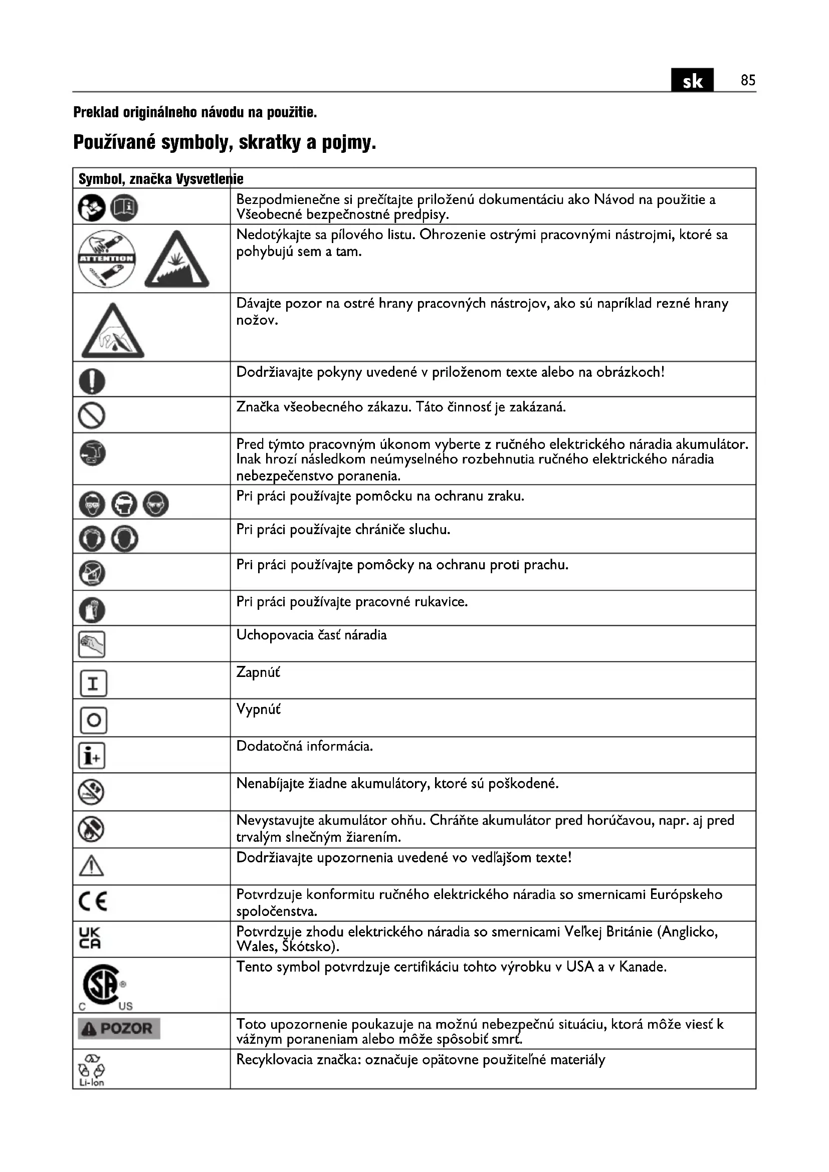 Preklad originálneho návodu na použitie. Používané symboly, skratky a pojmy. Symbol, značka Vysvetlenie Bezpodmienečne si prečítajte priloženú dokumentáciu ako Návod na použitie a Všeobecné bezpečnostné predpisy. Nedotýkajte sa pílového listu. Ohrozenie ostrými pracovnými nástrojmi, ktoré sa pohybujú sem a tam. Dávajte pozor na ostré hrany pracovných nástrojov, ako sú napríklad rezné hrany nožov. Dodržiavajte pokyny uvedené v priloženom texte alebo na obrázkoch! Značka všeobecného zákazu. Táto činnosť je zakázaná. Pred týmto pracovným úkonom vyberte z ručného elektrického náradia akumulátor. Inak hrozí následkom neúmyselného rozbehnutia ručného elektrického náradia nebezpečenstvo poranenia. Pri práci používajte pomôcku na ochranu zraku. Pri práci používajte chrániče sluchu. Pri práci používajte pomôcky na ochranu proti prachu. Pri práci používajte pracovné rukavice. Uchopovacia časť náradia Zapnúť Vypnúť Dodatočná informácia. Nenabíjajte žiadne akumulátory, ktoré sú poškodené. Nevystavujte akumulátor ohňu. Chráňte akumulátor pred horúčavou, napr. aj pred trvalým slnečným žiarením. Dodržiavajte upozornenia uvedené vo vedľajšom texte! Potvrdzuje konformitu ručného elektrického náradia so smernicami Európskeho spoločenstva. Potvrdzuje zhodu elektrického náradia so smernicami Veľkej Británie (Anglicko, Wales, Škótsko). Tento symbol potvrdzuje certifikáciu tohto výrobku v USA a v Kanade. Toto upozornenie poukazuje na možnú nebezpečnú situáciu, ktorá môže viesť k vážnym poraneniam alebo môže spôsobiť smrť. Recyklovacia značka: označuje opätovne použiteľné materiály86
