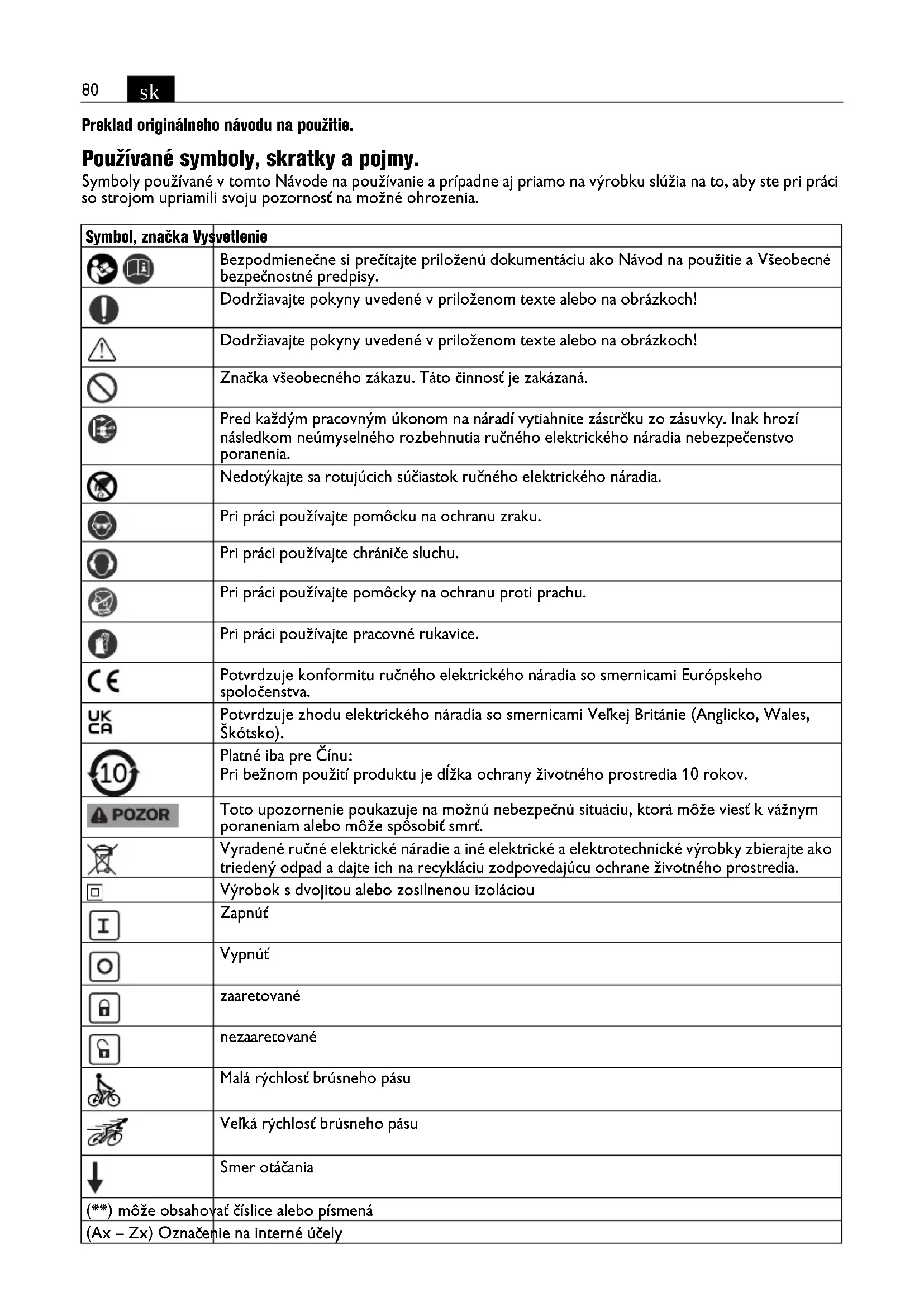 Preklad originálneho návodu na použitie. Používané symboly, skratky a pojmy. Symboly používané v tomto Návode na používanie a prípadne aj priamo na výrobku slúžia na to, aby ste pri práci so strojom upriamili svoju pozornosť na možné ohrozenia. Symbol, značka Vysvetlenie Bezpodmienečne si prečítajte priloženú dokumentáciu ako Návod na použitie a Všeobecné bezpečnostné predpisy. Dodržiavajte pokyny uvedené v priloženom texte alebo na obrázkoch! Dodržiavajte pokyny uvedené v priloženom texte alebo na obrázkoch! Značka všeobecného zákazu. Táto činnosť je zakázaná. Pred každým pracovným úkonom na náradí vytiahnite zástrčku zo zásuvky. Inak hrozí následkom neúmyselného rozbehnutia ručného elektrického náradia nebezpečenstvo poranenia. Nedotýkajte sa rotujúcich súčiastok ručného elektrického náradia. Pri práci používajte pomôcku na ochranu zraku. Pri práci používajte chrániče sluchu. Pri práci používajte pomôcky na ochranu proti prachu. Pri práci používajte pracovné rukavice. Potvrdzuje konformitu ručného elektrického náradia so smernicami Európskeho spoločenstva. Potvrdzuje zhodu elektrického náradia so smernicami Veľkej Británie (Anglicko, Wales, Škótsko). Platné iba pre Čínu: Pri bežnom použití produktu je dĺžka ochrany životného prostredia 10 rokov. Toto upozornenie poukazuje na možnú nebezpečnú situáciu, ktorá môže viesť k vážnym poraneniam alebo môže spôsobiť smrť. Vyradené ručné elektrické náradie a iné elektrické a elektrotechnické výrobky zbierajte ako triedený odpad a dajte ich na recykláciu zodpovedajúcu ochrane životného prostredia. Výrobok s dvojitou alebo zosilnenou izoláciou Zapnúť Vypnúť zaaretované nezaaretované Malá rýchlosť brúsneho pásu Veľká rýchlosť brúsneho pásu Smer otáčania (**) môže obsahovať číslice alebo písmená (Ax – Zx) Označenie na interné účely81
