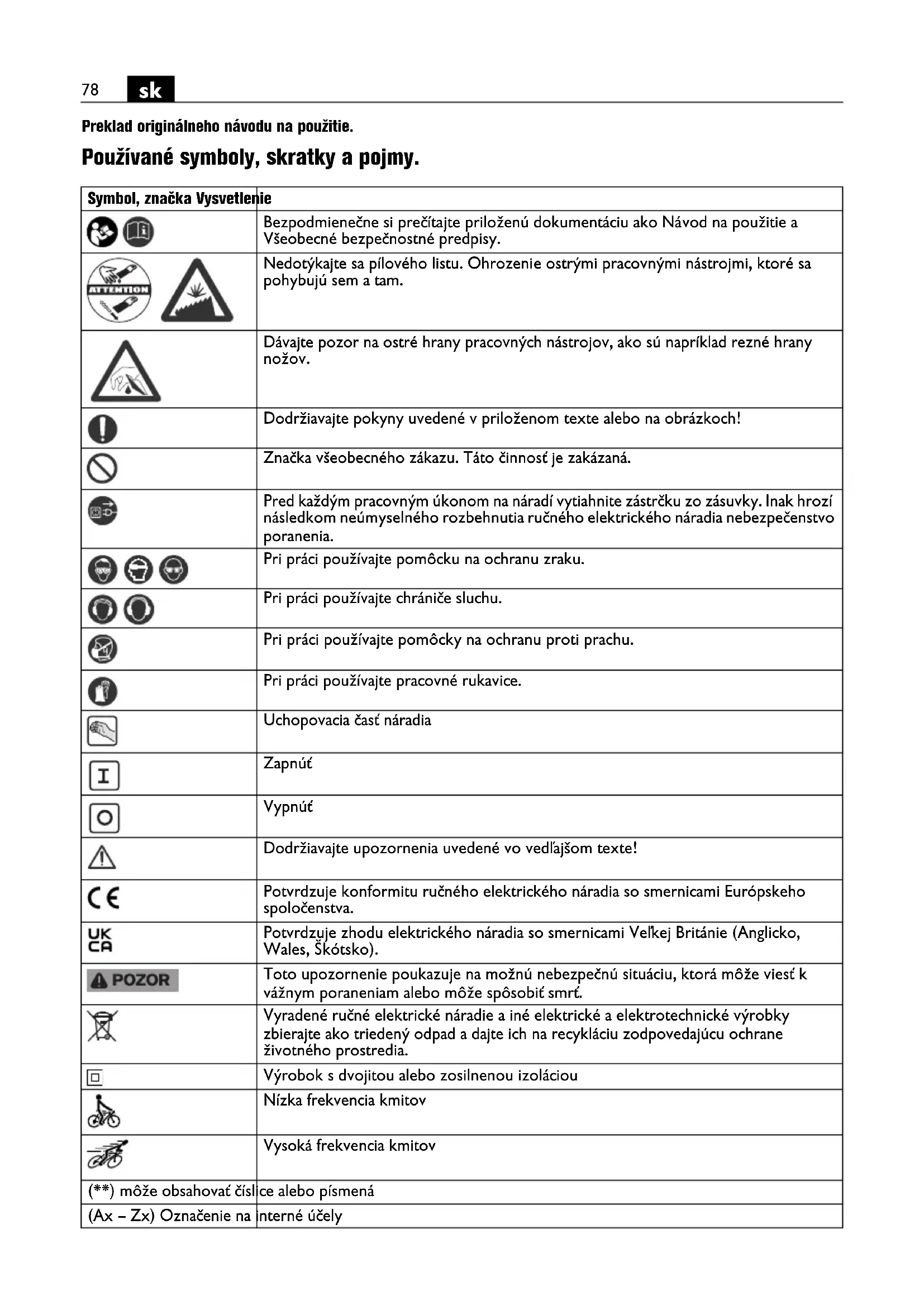 Preklad originálneho návodu na použitie. Používané symboly, skratky a pojmy. Symbol, značka Vysvetlenie Bezpodmienečne si prečítajte priloženú dokumentáciu ako Návod na použitie a Všeobecné bezpečnostné predpisy. Nedotýkajte sa pílového listu. Ohrozenie ostrými pracovnými nástrojmi, ktoré sa pohybujú sem a tam. Dávajte pozor na ostré hrany pracovných nástrojov, ako sú napríklad rezné hrany nožov. Dodržiavajte pokyny uvedené v priloženom texte alebo na obrázkoch! Značka všeobecného zákazu. Táto činnosť je zakázaná. Pred každým pracovným úkonom na náradí vytiahnite zástrčku zo zásuvky. Inak hrozí následkom neúmyselného rozbehnutia ručného elektrického náradia nebezpečenstvo poranenia. Pri práci používajte pomôcku na ochranu zraku. Pri práci používajte chrániče sluchu. Pri práci používajte pomôcky na ochranu proti prachu. Pri práci používajte pracovné rukavice. Uchopovacia časť náradia Zapnúť Vypnúť Dodržiavajte upozornenia uvedené vo vedľajšom texte! Potvrdzuje konformitu ručného elektrického náradia so smernicami Európskeho spoločenstva. Potvrdzuje zhodu elektrického náradia so smernicami Veľkej Británie (Anglicko, Wales, Škótsko). Toto upozornenie poukazuje na možnú nebezpečnú situáciu, ktorá môže viesť k vážnym poraneniam alebo môže spôsobiť smrť. Vyradené ručné elektrické náradie a iné elektrické a elektrotechnické výrobky zbierajte ako triedený odpad a dajte ich na recykláciu zodpovedajúcu ochrane životného prostredia. Výrobok s dvojitou alebo zosilnenou izoláciou Nízka frekvencia kmitov Vysoká frekvencia kmitov (**) môže obsahovať číslice alebo písmená (Ax – Zx) Označenie na interné účely79