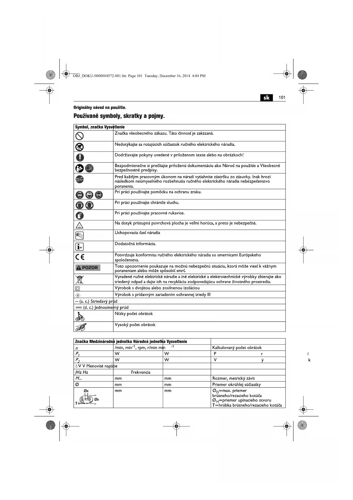 Originálny návod na použitie. Používané symboly, skratky a pojmy. Symbol, značka Vysvetlenie Značka všeobecného zákazu. Táto činnosť je zakázaná. Nedotýkajte sa rotujúcich súčiastok ručného elektrického náradia. Dodržiavajte pokyny uvedené v priloženom texte alebo na obrázkoch! Bezpodmienečne si prečítajte priloženú dokumentáciu ako Návod na použitie a Všeobecné bezpečnostné predpisy. Pred každým pracovným úkonom na náradí vytiahnite zástrčku zo zásuvky. Inak hrozí následkom neúmyselného rozbehnutia ručného elektrického náradia nebezpečenstvo poranenia. Pri práci používajte pomôcku na ochranu zraku. Pri práci používajte chrániče sluchu. Pri práci používajte pracovné rukavice. Na dotyk prístupná povrchová plocha je veľmi horúca, a preto je nebezpečná. Uchopovacia časť náradia Dodatočná informácia. Potvrdzuje konformitu ručného elektrického náradia so smernicami Európskeho spoločenstva. Toto upozornenie poukazuje na možnú nebezpečnú situáciu, ktorá môže viesť k vážnym poraneniam alebo môže spôsobiť smrť. Vyradené ručné elektrické náradie a iné elektrické a elektrotechnické výrobky zbierajte ako triedený odpad a dajte ich na recykláciu zodpovedajúcu ochrane životného prostredia. Výrobok s dvojitou alebo zosilnenou izoláciou Výrobok s prídavným zariadením ochrannej triedy III ~ (a. c.) Striedavý prúd (d. c.) Jednosmerný prúd Nízky počet obrátok Vysoký počet obrátok Značka Medzinárodná jednotka Národná jednotka Vysvetlenie