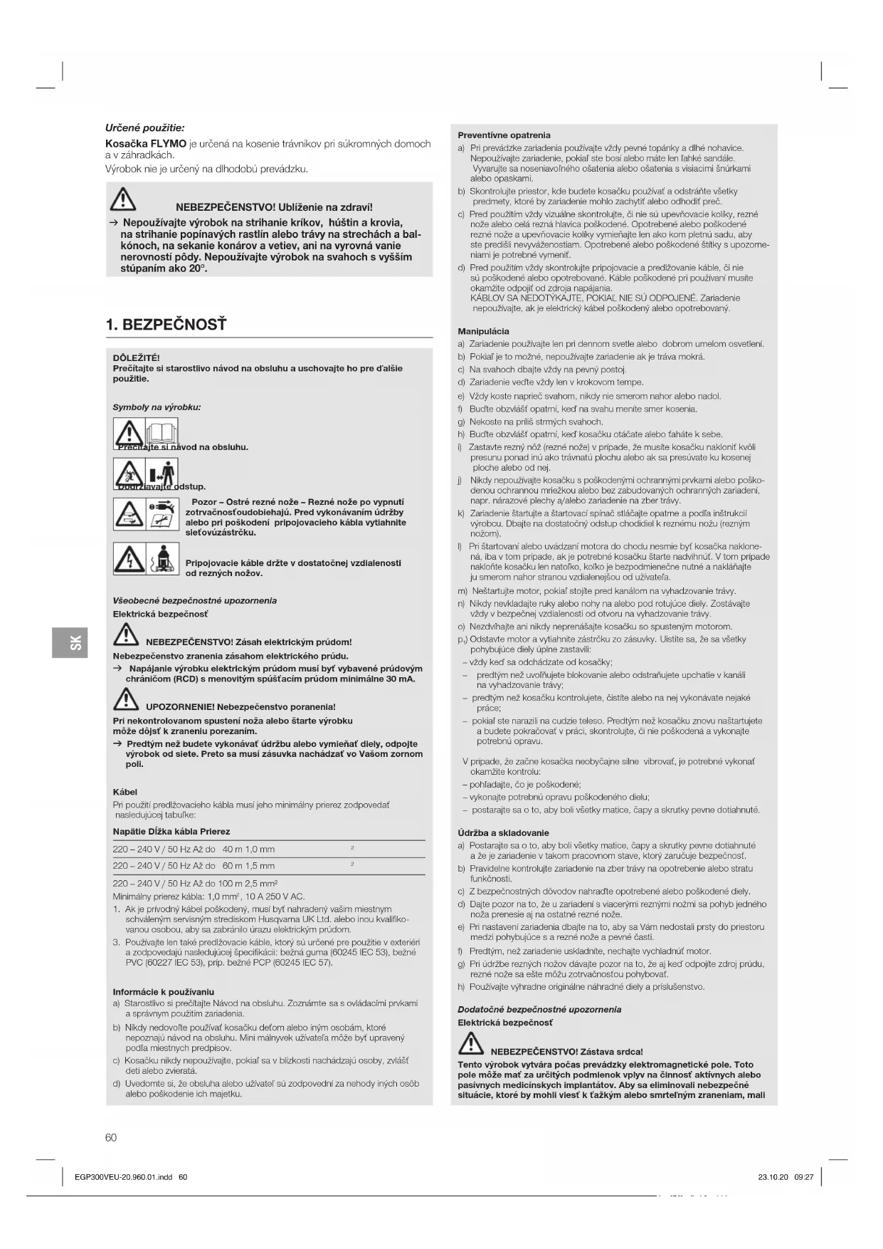Určené použitie: Kosačka FLYMO je určená na kosenie trávnikov pri súkromných domoch a v záhradkách. Výrobok nie je určený na dlhodobú prevádzku. NEBEZPEČENSTVO! Ublíženie na zdraví! v Nepoužívajte výrobok na strihanie kríkov, húštin a krovia, na strihanie popínavých rastlín alebo trávy na strechách a bal- kónoch, na sekanie konárov a vetiev, ani na vyrovná vanie nerovností pôdy. Nepoužívajte výrobok na svahoch s vyšším stúpaním ako 20°. DÔLEŽITÉ! Prečítajte si starostlivo návod na obsluhu a uschovajte ho pre ďalšie použitie. Symboly na výrobku: Prečítajte si návod na obsluhu. Dodržiavajte odstup. Pozor – Ostré rezné nože – Rezné nože po vypnutí zotrvačnosťou dobiehajú. Pred vykonávaním údržby alebo pri poškodení pripojovacieho kábla vytiahnite sieťovú zástrčku. Pripojovacie káble držte v dostatočnej vzdialenosti od rezných nožov. Všeobecné bezpečnostné upozornenia Elektrická bezpečnosť NEBEZPEČENSTVO! Zásah elektrickým prúdom! Nebezpečenstvo zranenia zásahom elektrického prúdu. v Napájanie výrobku elektrickým prúdom musí byť vybavené prúdovým chráničom (RCD) s menovitým spúšťacím prúdom minimálne 30 mA. UPOZORNENIE! Nebezpečenstvo poranenia! Pri nekontrolovanom spustení noža alebo štarte výrobku môže dôjsť k zraneniu porezaním. v Predtým než budete vykonávať údržbu alebo vymieňať diely, odpojte výrobok od siete. Preto sa musí zásuvka nachádzať vo Vašom zornom poli. Kábel Pri použití predlžovacieho kábla musí jeho minimálny prierez zodpovedať nasledujúcej tabuľke: Napätie Dĺžka kábla Prierez 220 – 240 V / 50 Hz Až do 40 m 1,0 mm