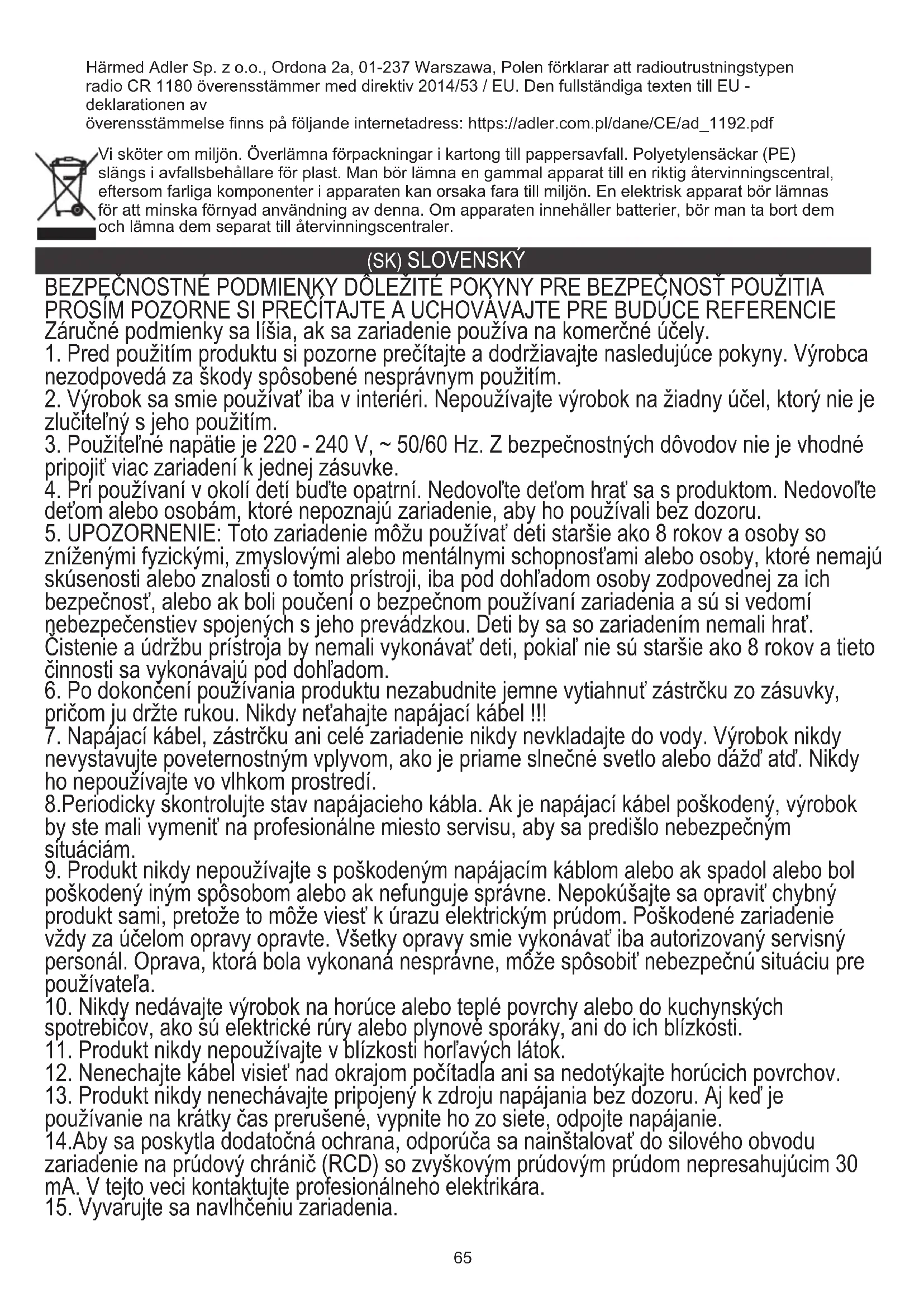 Technické detaily: Napájanie: 230 ~V 50 Hz. Bluetooth: V 5.0 Batéria: 2x AAA 1,5V (batérie len na zálohovanie hodín) FM: 87,5 – 108 MHz. Bezdrôtové nabíjanie: 5V 1A Starostlivosť o životné prostredie. Kartónový obal odovzdajte do zberných surovín. Polyetylénové vrecká (PE) vyhoďte do kontajnera na plast. Opotrebený spotrebič odovzdajte na príslušný zberný dvor, nebezpečné látky spotrebiča môžu predstavovať riziko pre životné prostredie. Elektrospotrebič odstráňte tak, aby nedochádzalo j jeho ďalšiemu použitiu. Ak sa v spotrebiči nachádzajú batérie, vyberte ich a odovzdajte ich Týmto spoločnosť Adler Sp. z o.o., Ordona 2a, 01-237 Varšava, Poľsko vyhlasuje, že typ rádiového zariadenia rádio CR 1180 je v súlade so smernicou 2014/53 / EÚ. Úplné znenie vyhlásenia EÚ z zhoda je k dispozícii na tejto internetovej adrese: https://adler.com.pl/dane/CE/ad_1192.pdf68 (IT) ITALIANO CONDIZIONI DI SICUREZZA ISTRUZIONI IMPORTANTI SULLA SICUREZZA D'USO LEGGERE ATTENTAMENTE E CONSERVARE IL FUTURO RIFERIMENTO Le condizioni di garanzia sono diverse se il dispositivo viene utilizzato a fini commerciali.