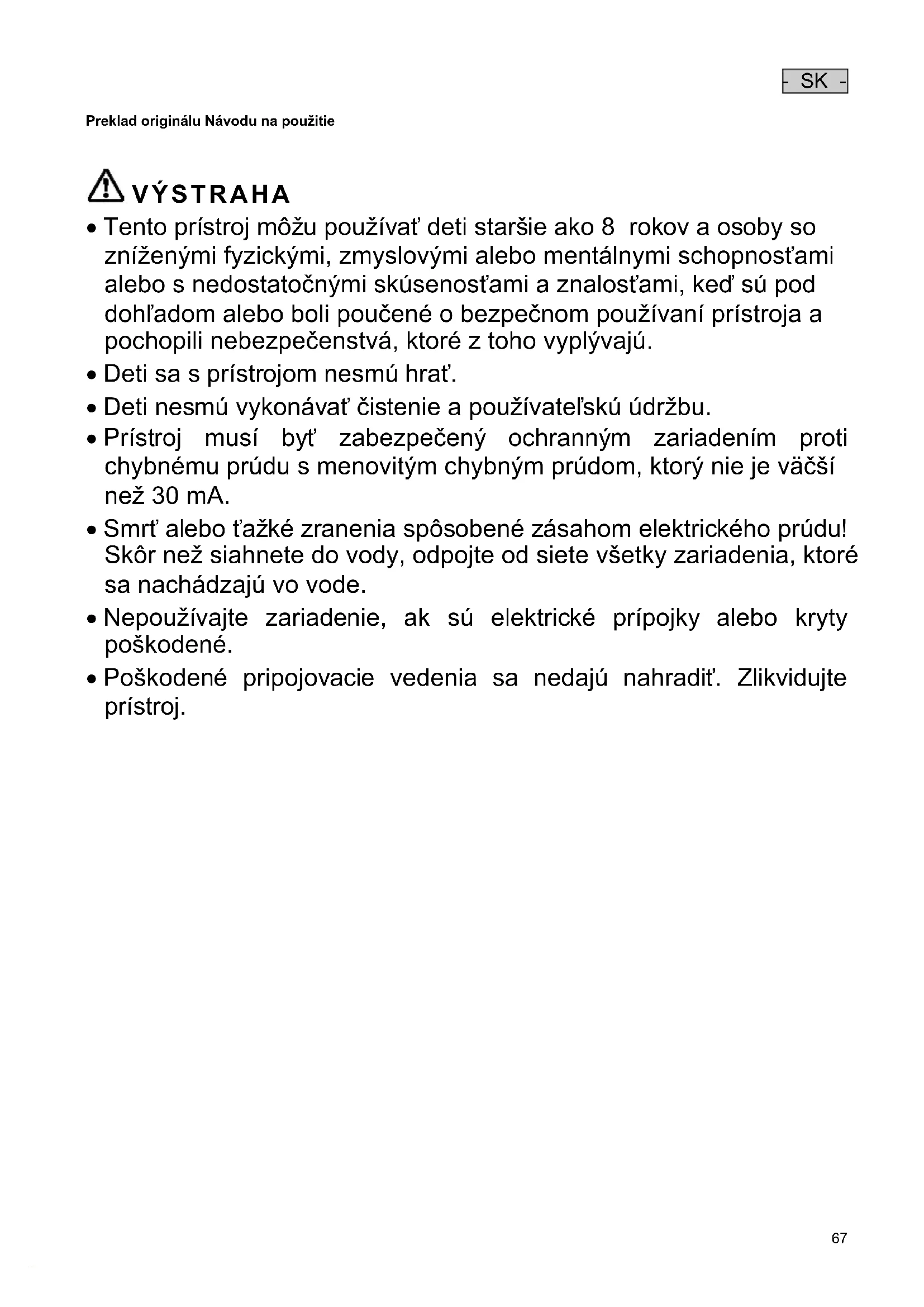 - Prístroj musí byť zabezpečený ochranným zariadením proti chybnému prúdu s menovitým chybným prúdom, ktorý nie je väčší než 30 mA.