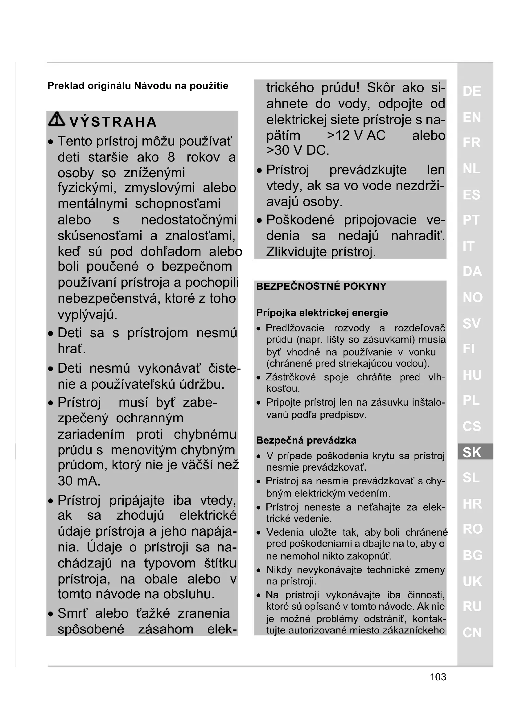 - Smrť alebo ťažké zranenia spôsobené zásahom elek- trického prúdu! Skôr ako si- ahnete do vody, odpojte od elektrickej siete prístroje s na- pätím >12 V AC alebo >30 V DC.