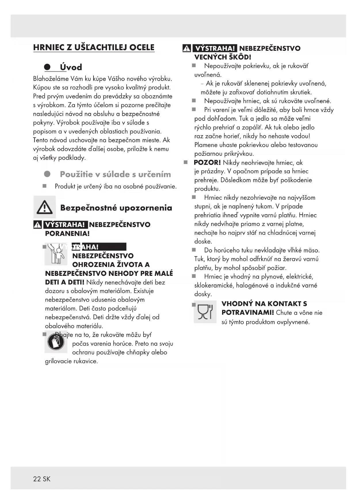 VECNÝCH ŠKÔD! Nepoužívajte pokrievku, ak je rukoväť uvoľnená. – Ak je rukoväť sklenenej pokrievky uvoľnená, môžete ju zafixovať dotiahnutím skrutiek. Nepoužívajte hrniec, ak sú rukoväte uvoľnené. Pri varení je veľmi dôležité, aby boli hrnce vždy pod dohľadom. Tuk a jedlo sa môže veľmi rýchlo prehriať a zapáliť. Ak tuk alebo jedlo raz začne horieť, nikdy ho nehaste vodou! Plamene uhaste pokrievkou alebo testovanou požiarnou prikrývkou. POZOR! Nikdy neohrievajte hrniec, ak je prázdny. V opačnom prípade sa hrniec prehreje. Dôsledkom môže byť poškodenie produktu. Hrniec nikdy nezohrievajte na najvyššom stupni, ak je naplnený tukom. V prípade prehriatia ihneď vypnite varnú platňu. Hrniec nikdy nedvíhajte priamo z varnej platne, nechajte ho najprv stáť na chladnúcej varnej doske. Do horúceho tuku nevkladajte vlhké mäso. Tuk, ktorý by mohol odfrknúť na žeravú varnú platňu, by mohol spôsobiť požiar. Hrniec je vhodný na plynové, elektrické, sklokeramické, halogénové a indukčné varné dosky.