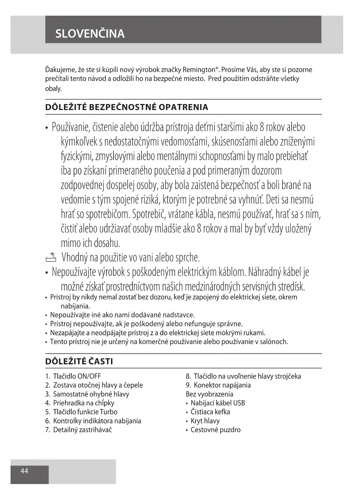 AE44 Ďakujeme, že ste si kúpili nový výrobok značky Remington®. Prosíme Vás, aby ste si pozorne prečítali tento návod a odložili ho na bezpečné miesto. Pred použitím odstráňte všetky obaly.