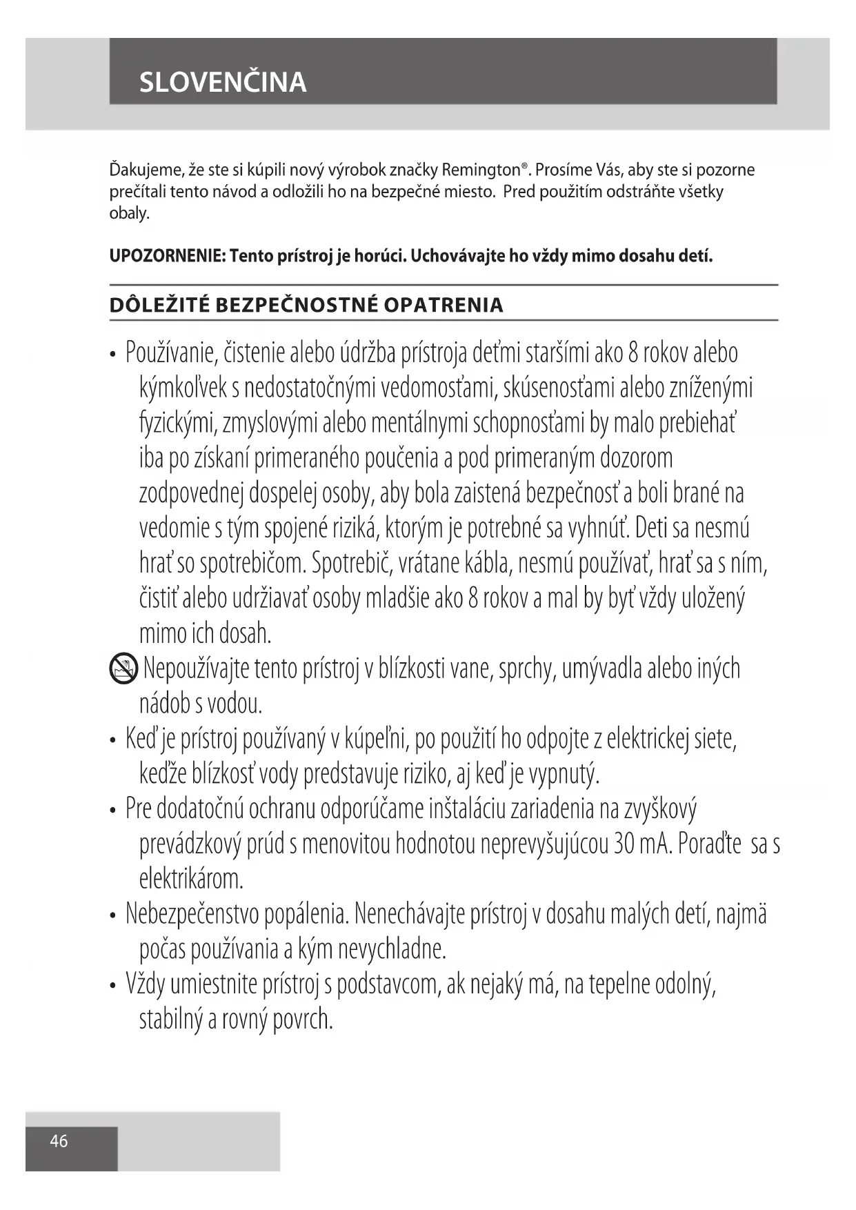 AE46 Ďakujeme, že ste si kúpili nový výrobok značky Remington®. Prosíme Vás, aby ste si pozorne prečítali tento návod a odložili ho na bezpečné miesto. Pred použitím odstráňte všetky obaly. UPOZORNENIE: Tento prístroj je horúci. Uchovávajte ho vždy mimo dosahu detí.