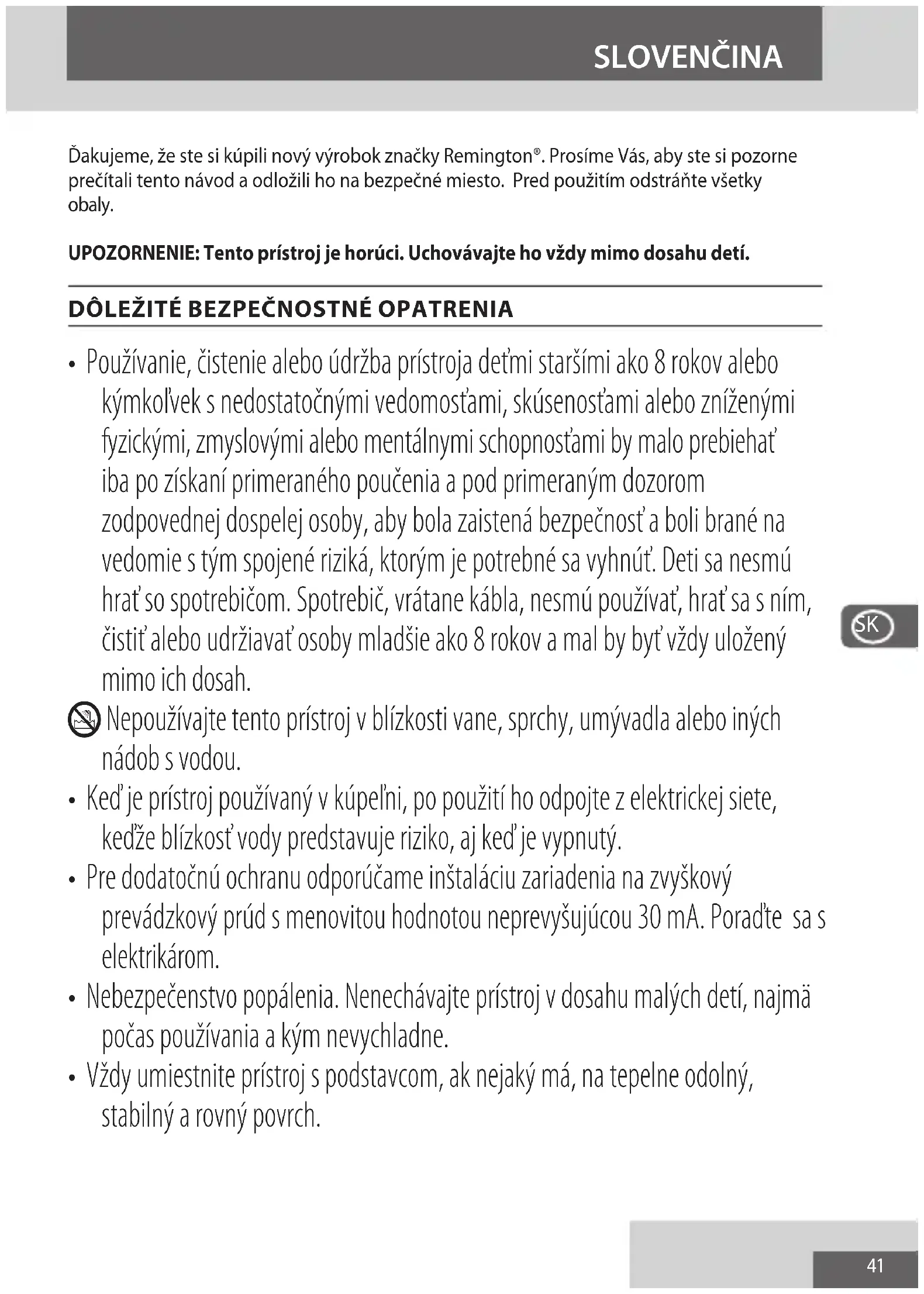 - Ak sa elektrický kábel tohto prístroja poškodí, prestaňte okamžite s jeho používaním a prístroj odovzdajte do najbližšieho servisného strediska Remington® na opravu alebo výmenu, aby ste predišli akémukoľvek riziku.