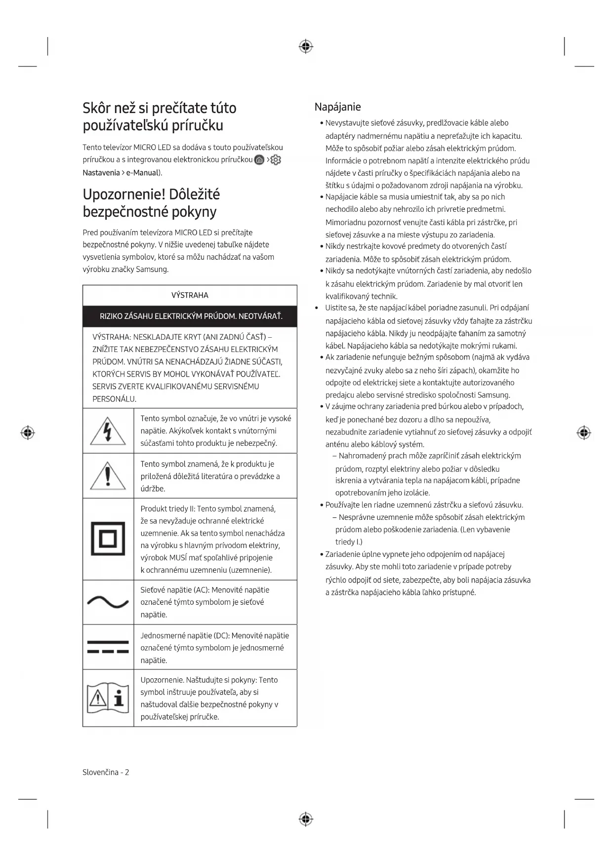 Nastavenia > e-Manual). Upozornenie! Dôležité bezpečnostné pokyny Pred používaním televízora MICRO LED si prečítajte bezpečnostné pokyny. Vnižšie uvedenej tabuľke nájdete vysvetlenia symbolov, ktoré sa môžu nachádzať na vašom výrobku značky Samsung. VÝSTRAHA RIZIKO ZÁSAHU ELEKTRICKÝM PRÚDOM. NEOTVÁRAŤ. VÝSTRAHA: NESKLADAJTE KRYT (ANI ZADNÚ ČASŤ) – ZNÍŽITE TAK NEBEZPEČENSTVO ZÁSAHU ELEKTRICKÝM PRÚDOM. VNÚTRI SA NENACHÁDZAJÚ ŽIADNE SÚČASTI, KTORÝCH SERVIS BY MOHOL VYKONÁVAŤ POUŽÍVATEĽ.