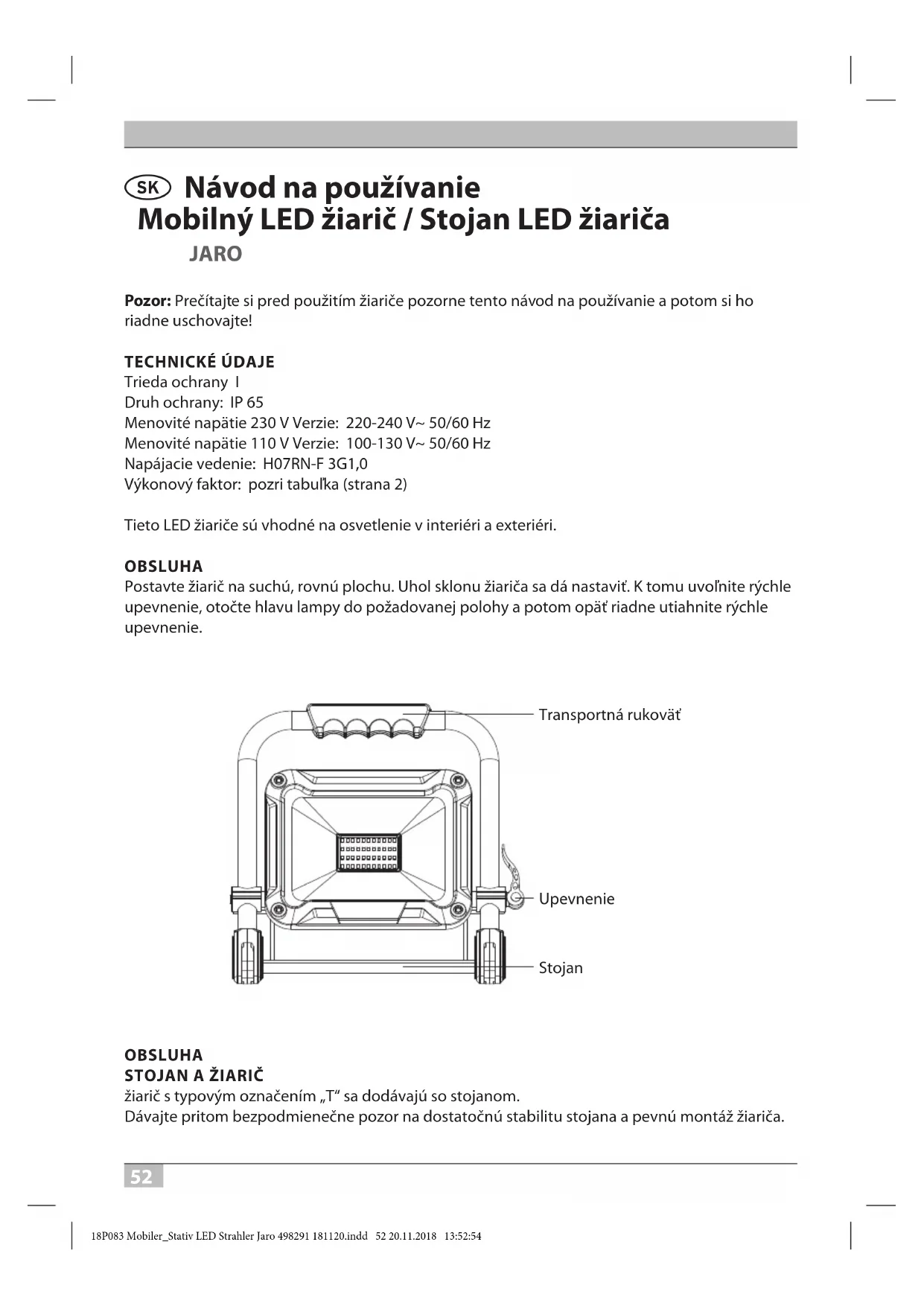 žiarič s typovým označením „T“ sa dodávajú so stojanom. Dávajte pritom bezpodmienečne pozor na dostatočnú stabilitu stojana a pevnú montáž žiariča. 18P083 Mobiler_Stativ LED Strahler Jaro 498291 181120.indd 52 20.11.2018 13:52:5453 JARO Návod na používanie