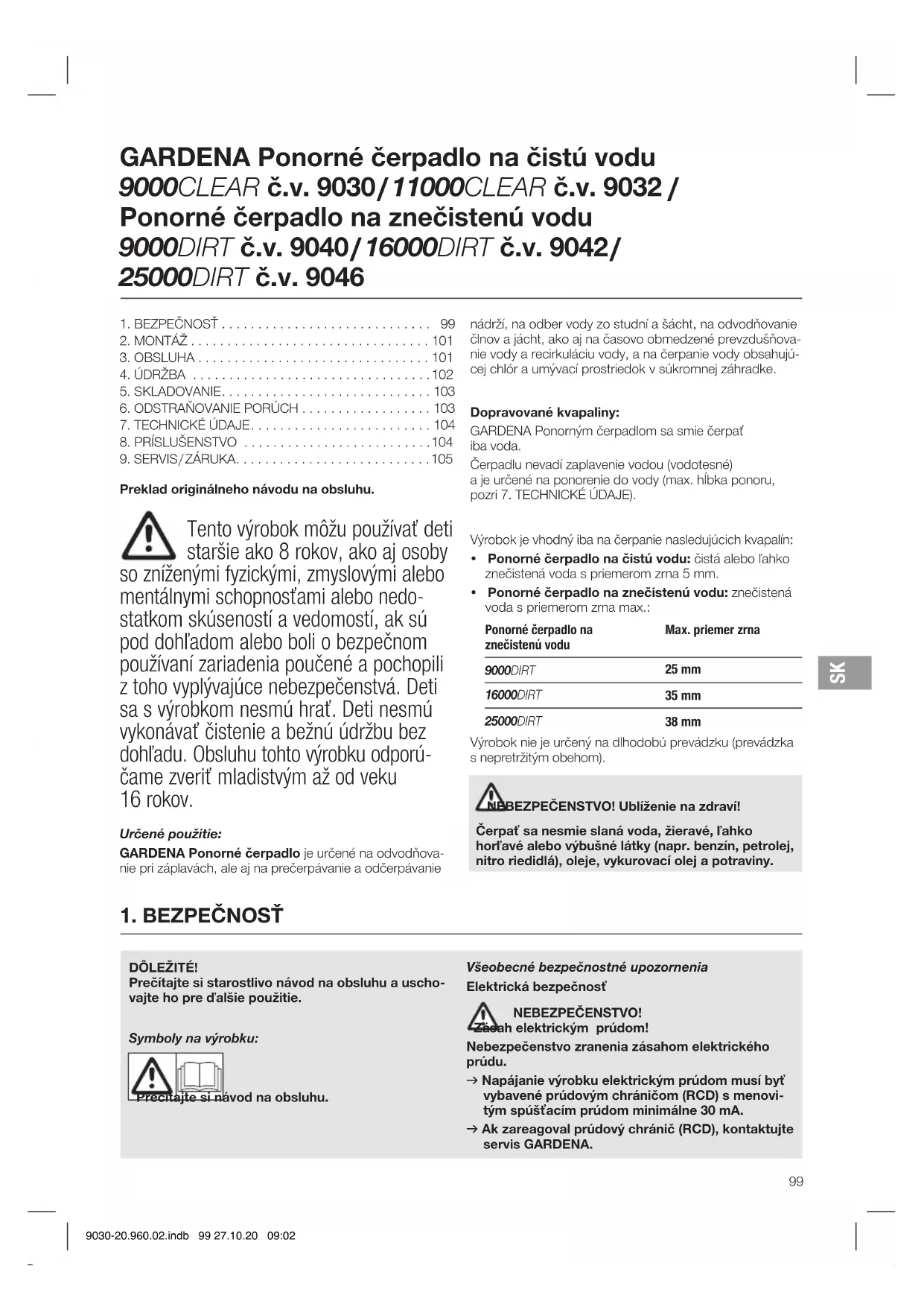 DÔLEŽITÉ! Prečítajte si starostlivo návod na obsluhu a uscho- vajte ho pre ďalšie použitie. Symboly na výrobku: Prečítajte si návod na obsluhu. Všeobecné bezpečnostné upozornenia Elektrická bezpečnosť NEBEZPEČENSTVO! Zásah elektrickým prúdom! Nebezpečenstvo zranenia zásahom elektrického prúdu. v Napájanie výrobku elektrickým prúdom musí byť vybavené prúdovým chráničom (RCD) s menovi- tým spúšťacím prúdom minimálne 30 mA. v Ak zareagoval prúdový chránič (RCD), kontaktujte servis GARDENA. GARDENA Ponorné čerpadlo na čistú vodu 9000CLEAR č.v. 9030 / 11000CLEAR č.v. 9032 / Ponorné čerpadlo na znečistenú vodu 9000DIRT č.v. 9040 / 16000DIRT č.v. 9042 / 25000DIRT č.v. 9046