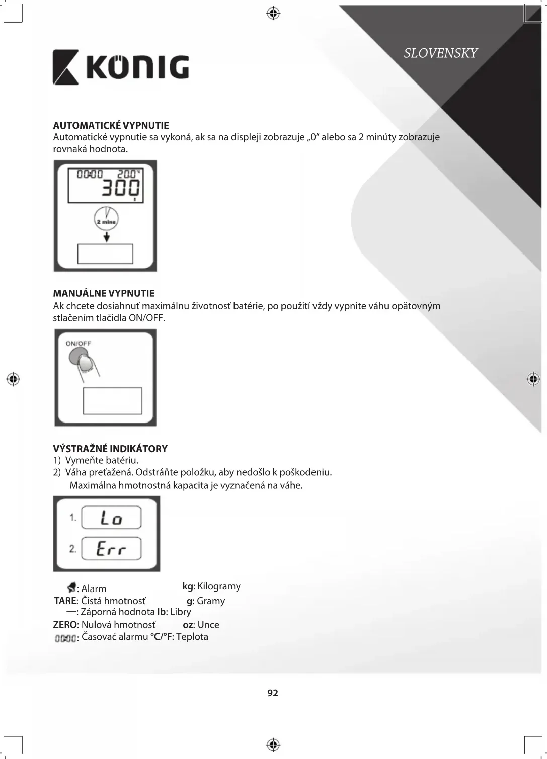 Ak má váha metrický (kilogramy, gramy) aj imperiálny (libry, unce) metrický systém, stlačením tlačidla UNIT môžete v priebehu váženia vykonať konverziu medzi týmito systémami. FUNKCIA „ZERO” (NULA) ALEBO „TARE“ (TARA) Ak chcete vážiť rôzne látky postupne za sebou, bez toho, aby ste z ich váhy odstraňovali, položte najskôr na váhu prvú látku a odčítajte nameranú hmotnosť. Tlačidlom Z/T vynulujete hodnotu na LCD na „0“ pred pridaním ďalšej látky. Túto operáciu môžete opakovať. Na LCD sa pri každom stlačení tlačidla Z/T zobrazí „----“ alebo „0g“. „----“ znamená nestabilný stav, chvíľu počkajte. Ikona „0g“ a „ZERO“ (NULA) v ľavom dolnom rohu LCD znamená, že funkcia „ZERO“ (NULA) je aktívna. Maximálna kapacita zostáva nezmenená.95 SLOVENSKY Na LCD sa pri každom stlačení tlačidla Z/T zobrazí „----“ alebo „0g“. „----“ znamená nestabilný stav, chvíľu počkajte. Ikona „0g“ a „TARE“ (TARA) v ľavom hornom rohu LCD znamená, že funkcia „TARE“ (TARA) je aktívna. Maximálna kapacita sa zníži o celkovú hmotnosť všetkých látok.