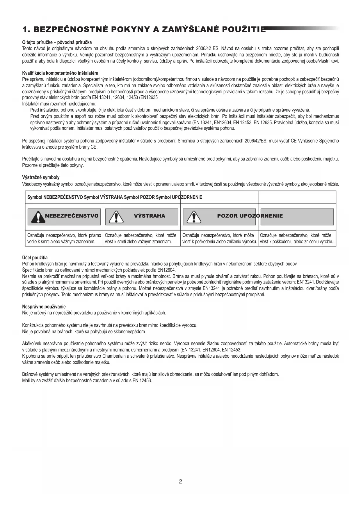 - Tento postup sa vyžaduje aj pri súkromných zariadeniach (nových alebo dodatočne namontovaných na ručne ovládanú bránu). Tento návod na inštaláciu a obsluhu si musí používateľ ponechať.