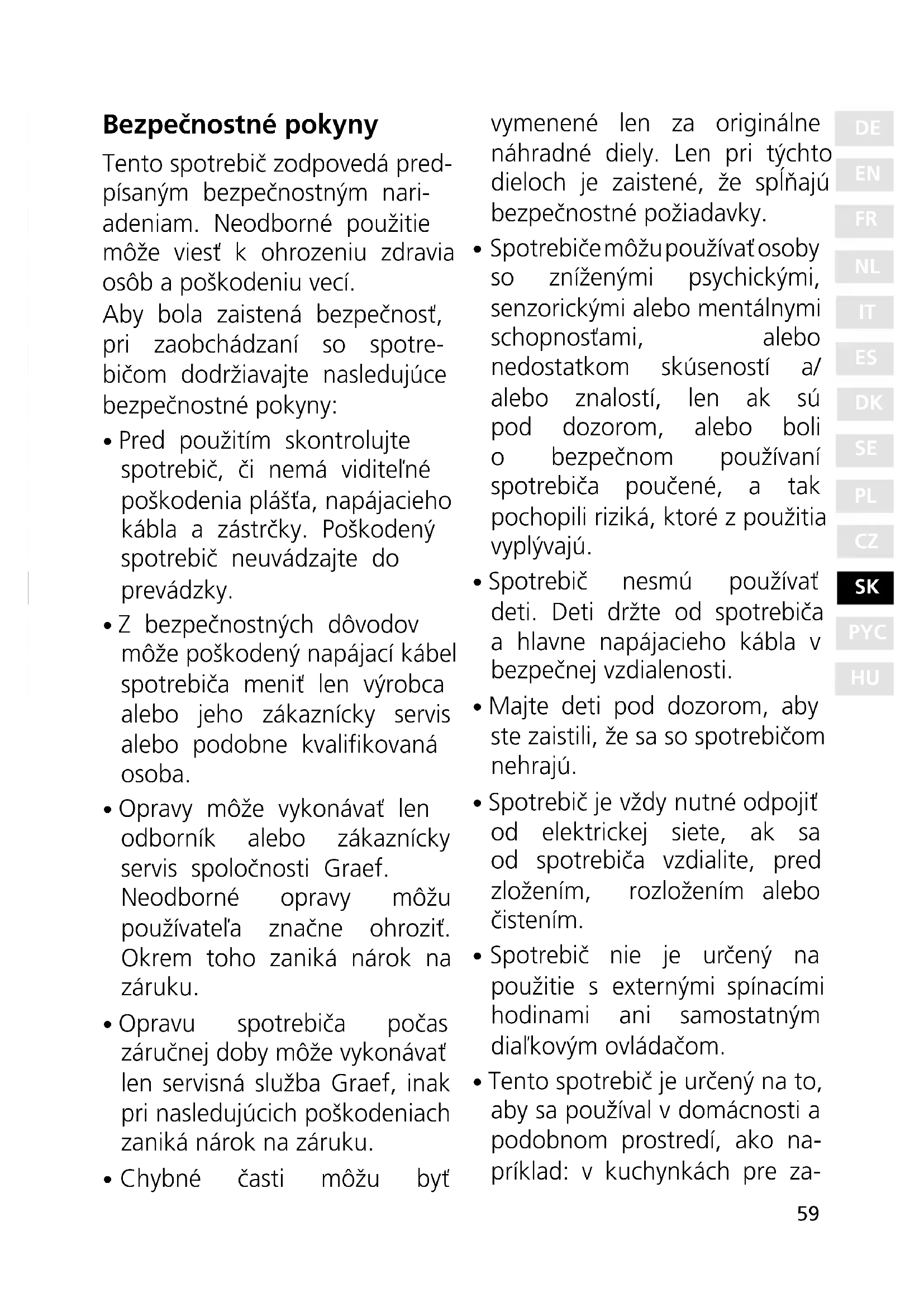 - Opravu spotrebiča počas záručnej doby môže vykonávať len servisná služba Graef, inak pri nasledujúcich poškodeniach zaniká nárok na záruku.