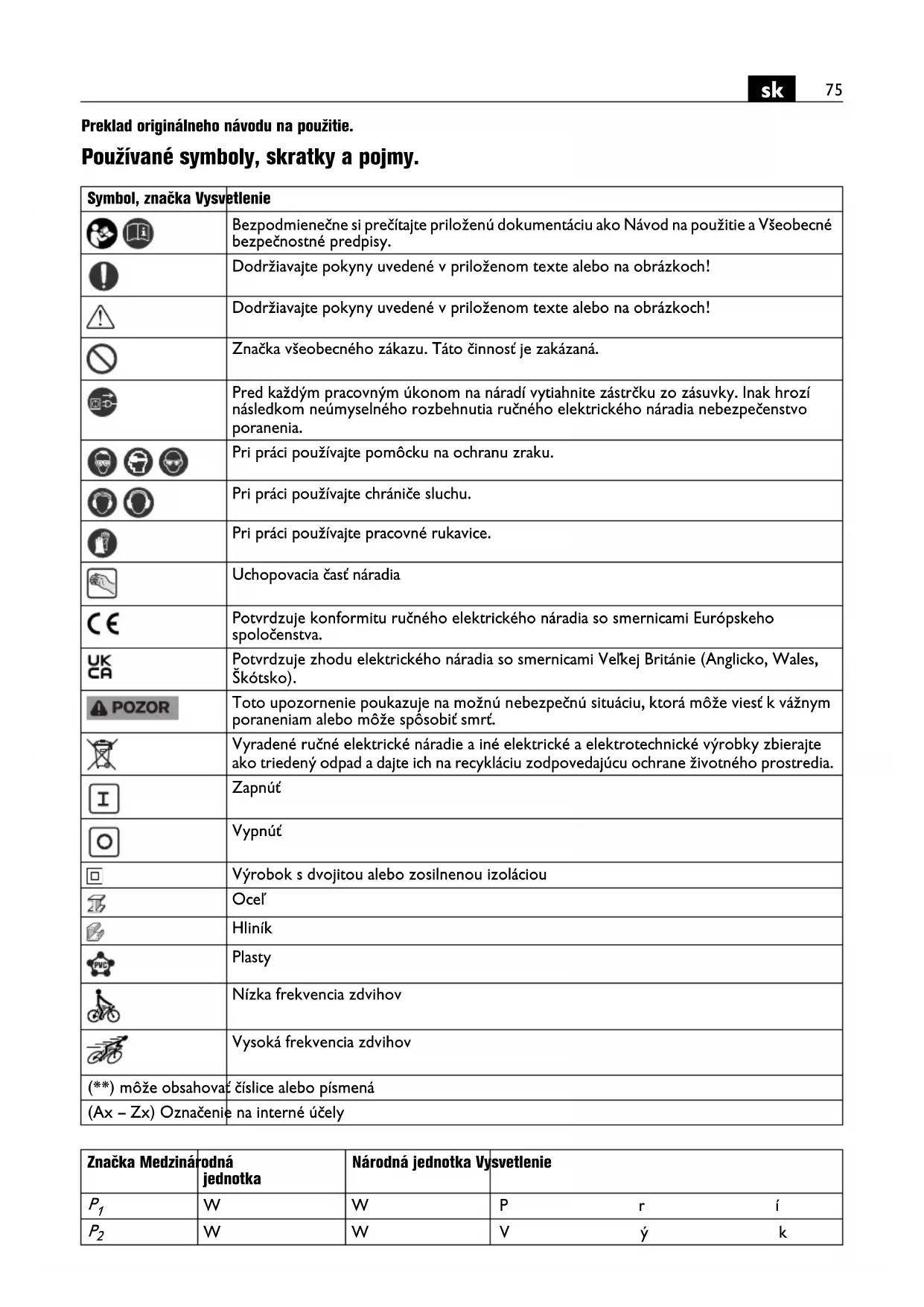 Preklad originálneho návodu na použitie. Používané symboly, skratky a pojmy. Symbol, značka Vysvetlenie Bezpodmienečne si prečítajte priloženú dokumentáciu ako Návod na použitie a Všeobecné bezpečnostné predpisy. Dodržiavajte pokyny uvedené v priloženom texte alebo na obrázkoch! Dodržiavajte pokyny uvedené v priloženom texte alebo na obrázkoch! Značka všeobecného zákazu. Táto činnosť je zakázaná. Pred každým pracovným úkonom na náradí vytiahnite zástrčku zo zásuvky. Inak hrozí následkom neúmyselného rozbehnutia ručného elektrického náradia nebezpečenstvo poranenia. Pri práci používajte pomôcku na ochranu zraku. Pri práci používajte chrániče sluchu. Pri práci používajte pracovné rukavice. Uchopovacia časť náradia Potvrdzuje konformitu ručného elektrického náradia so smernicami Európskeho spoločenstva. Potvrdzuje zhodu elektrického náradia so smernicami Veľkej Británie (Anglicko, Wales, Škótsko). Toto upozornenie poukazuje na možnú nebezpečnú situáciu, ktorá môže viesť k vážnym poraneniam alebo môže spôsobiť smrť. Vyradené ručné elektrické náradie a iné elektrické a elektrotechnické výrobky zbierajte ako triedený odpad a dajte ich na recykláciu zodpovedajúcu ochrane životného prostredia. Zapnúť Vypnúť Výrobok s dvojitou alebo zosilnenou izoláciou Oceľ Hliník Plasty Nízka frekvencia zdvihov Vysoká frekvencia zdvihov (**) môže obsahovať číslice alebo písmená (Ax – Zx) Označenie na interné účely Značka Medzinárodná jednotka Národná jednotka Vysvetlenie