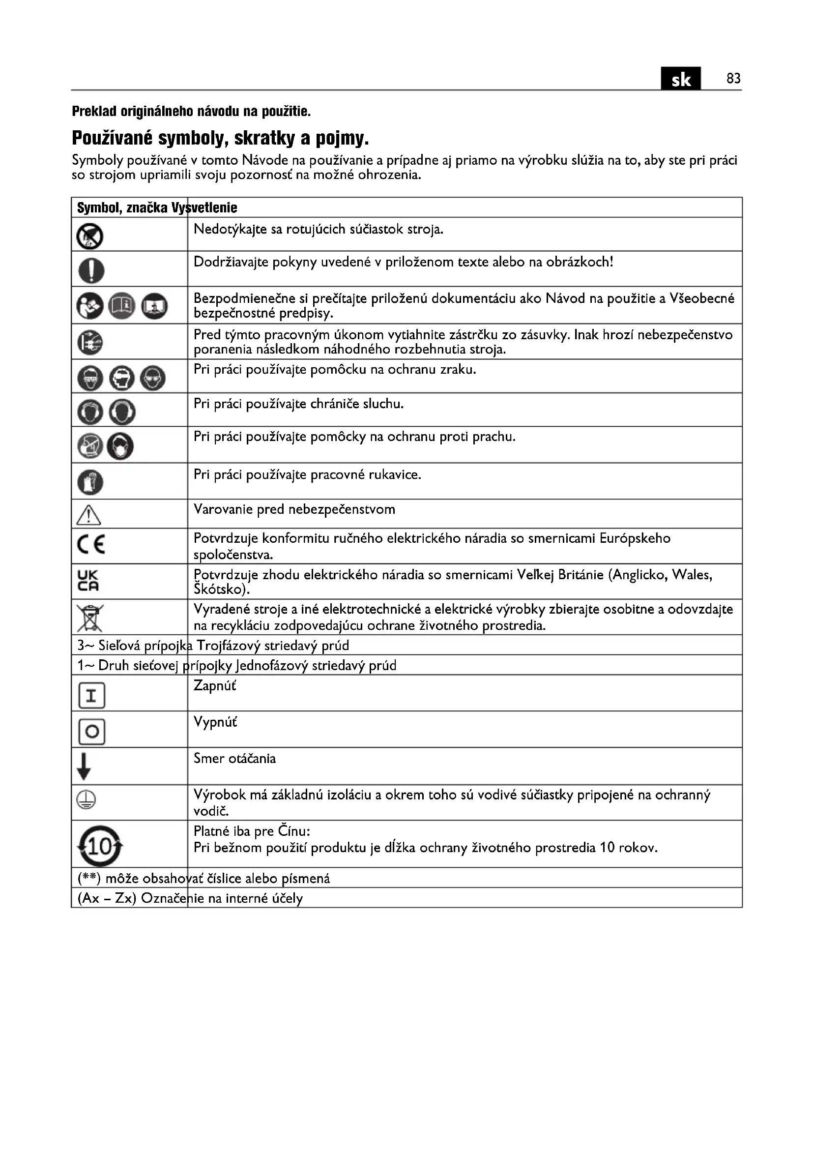 Preklad originálneho návodu na použitie. Používané symboly, skratky a pojmy. Symboly používané v tomto Návode na používanie a prípadne aj priamo na výrobku slúžia na to, aby ste pri práci so strojom upriamili svoju pozornosť na možné ohrozenia. Symbol, značka Vysvetlenie Nedotýkajte sa rotujúcich súčiastok stroja. Dodržiavajte pokyny uvedené v priloženom texte alebo na obrázkoch! Bezpodmienečne si prečítajte priloženú dokumentáciu ako Návod na použitie a Všeobecné bezpečnostné predpisy. Pred týmto pracovným úkonom vytiahnite zástrčku zo zásuvky. Inak hrozí nebezpečenstvo poranenia následkom náhodného rozbehnutia stroja. Pri práci používajte pomôcku na ochranu zraku. Pri práci používajte chrániče sluchu. Pri práci používajte pomôcky na ochranu proti prachu. Pri práci používajte pracovné rukavice. Varovanie pred nebezpečenstvom Potvrdzuje konformitu ručného elektrického náradia so smernicami Európskeho spoločenstva. Potvrdzuje zhodu elektrického náradia so smernicami Veľkej Británie (Anglicko, Wales, Škótsko). Vyradené stroje a iné elektrotechnické a elektrické výrobky zbierajte osobitne a odovzdajte na recykláciu zodpovedajúcu ochrane životného prostredia. 3~ Sieľová prípojka Trojfázový striedavý prúd 1~ Druh sieťovej prípojky Jednofázový striedavý prúd Zapnúť Vypnúť Smer otáčania Výrobok má základnú izoláciu a okrem toho sú vodivé súčiastky pripojené na ochranný vodič. Platné iba pre Čínu: Pri bežnom použití produktu je dĺžka ochrany životného prostredia 10 rokov. (**) môže obsahovať číslice alebo písmená (Ax – Zx) Označenie na interné účely84